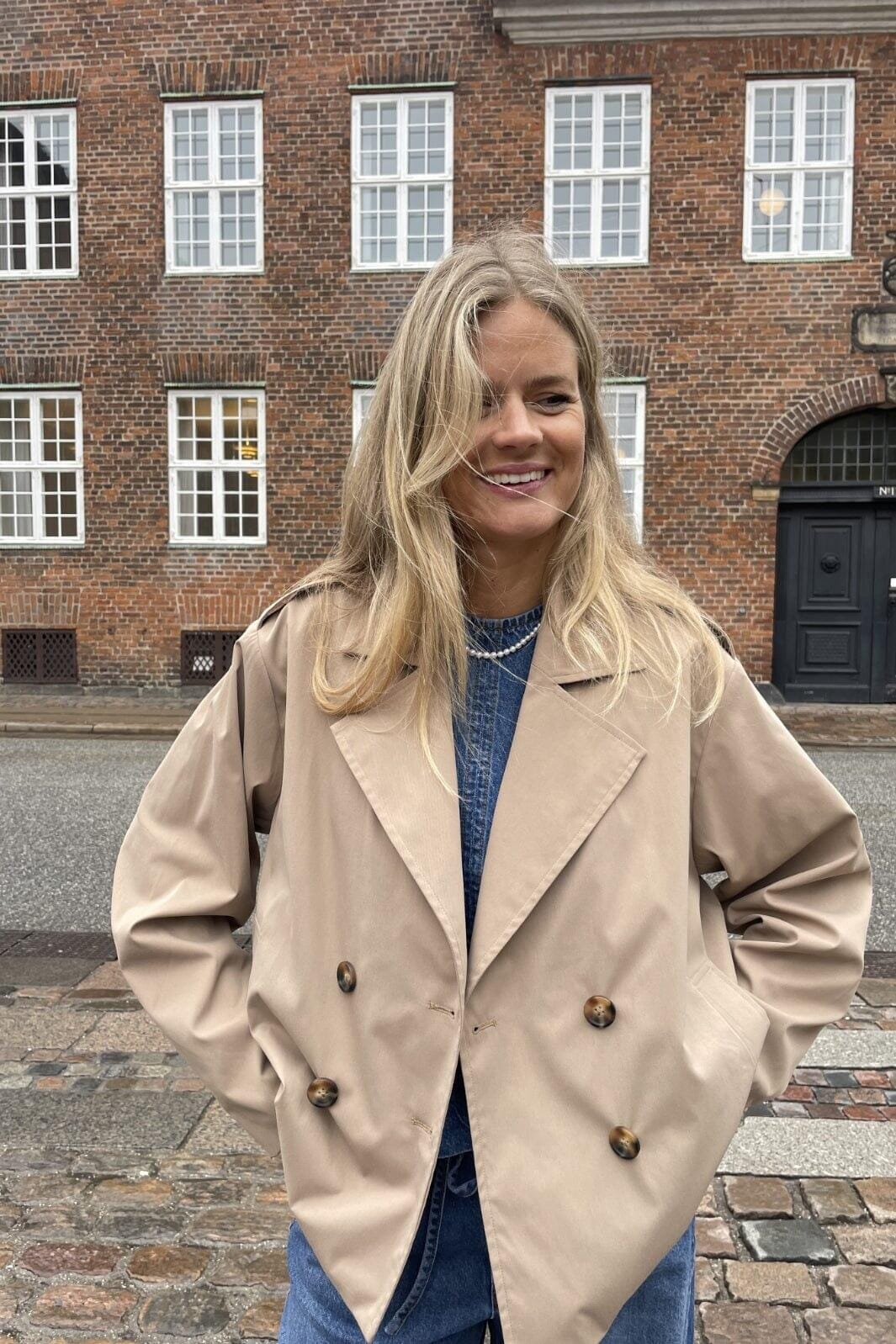 Beige jakke fra Global Funk med dobbeltradet front. Den har store knapper og en klassisk krage som gir jakken et rent og enkelt uttrykk.