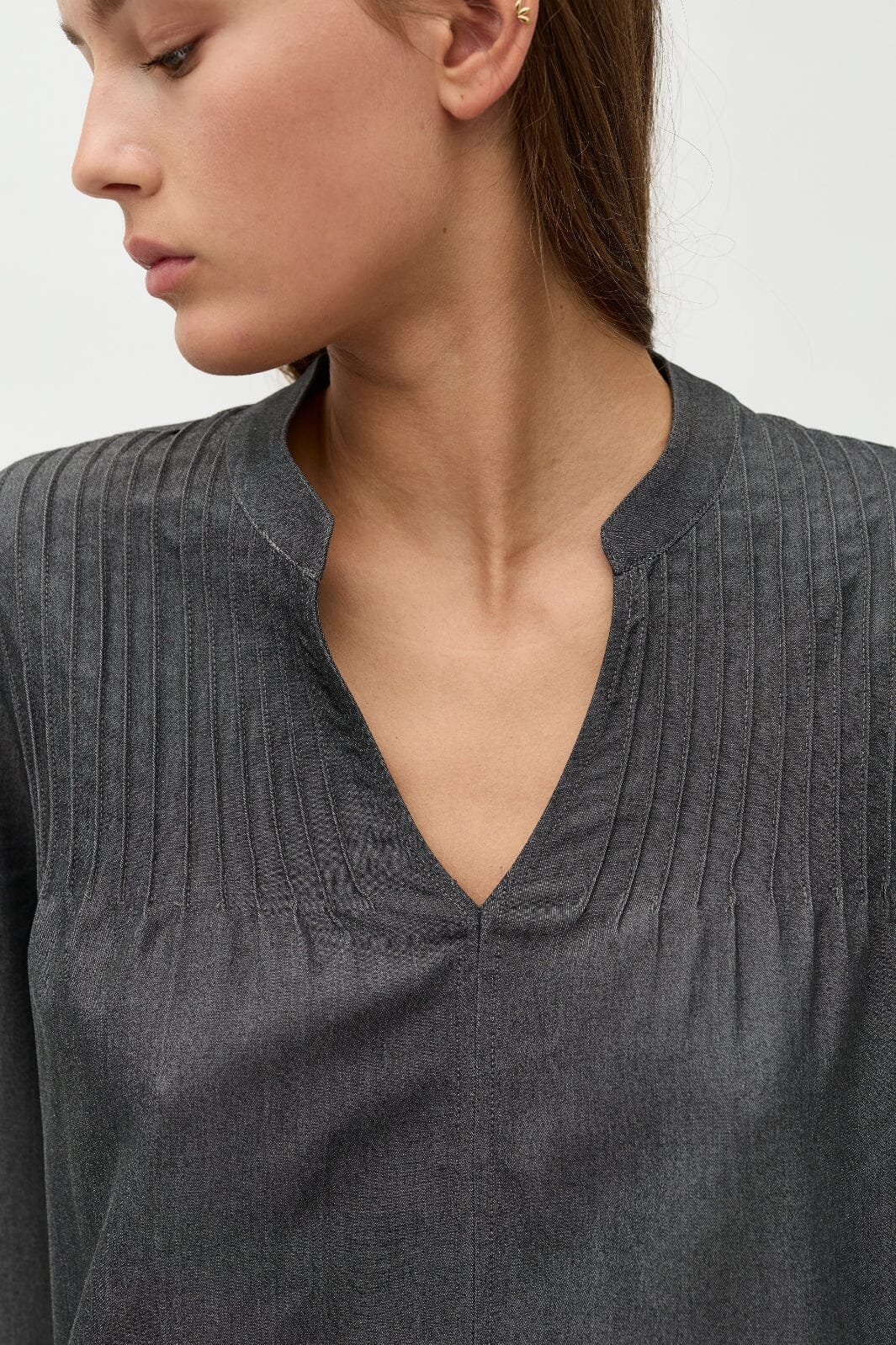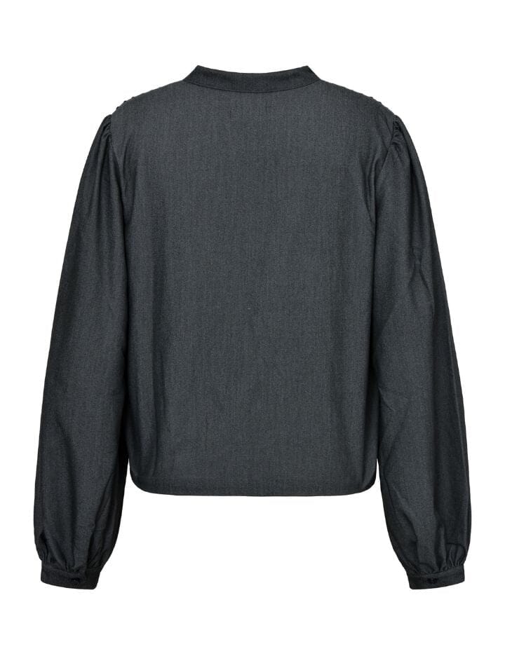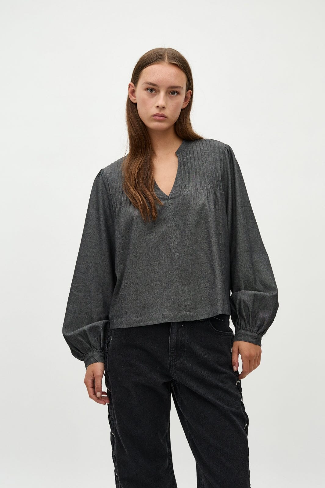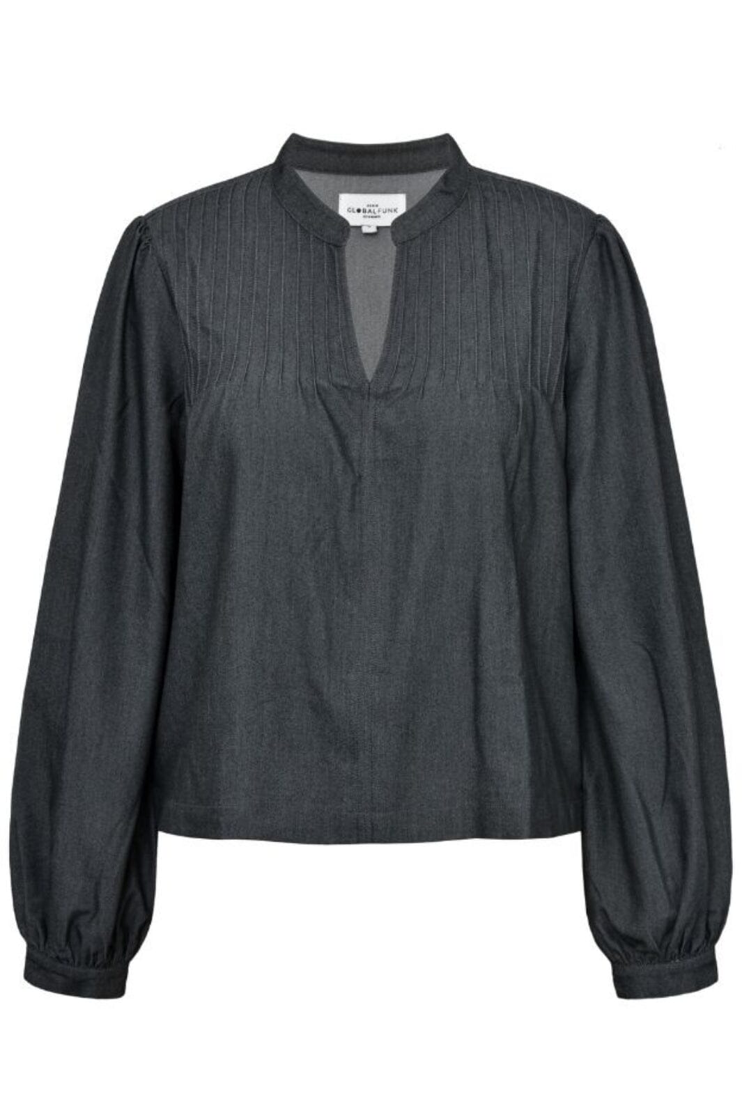Svart bluse fra Global Funk med v-halsutskjæring og vertikale plisseringer. Blusen har lange pufferm og dekorative sømmer som gir den et gjennomført design.