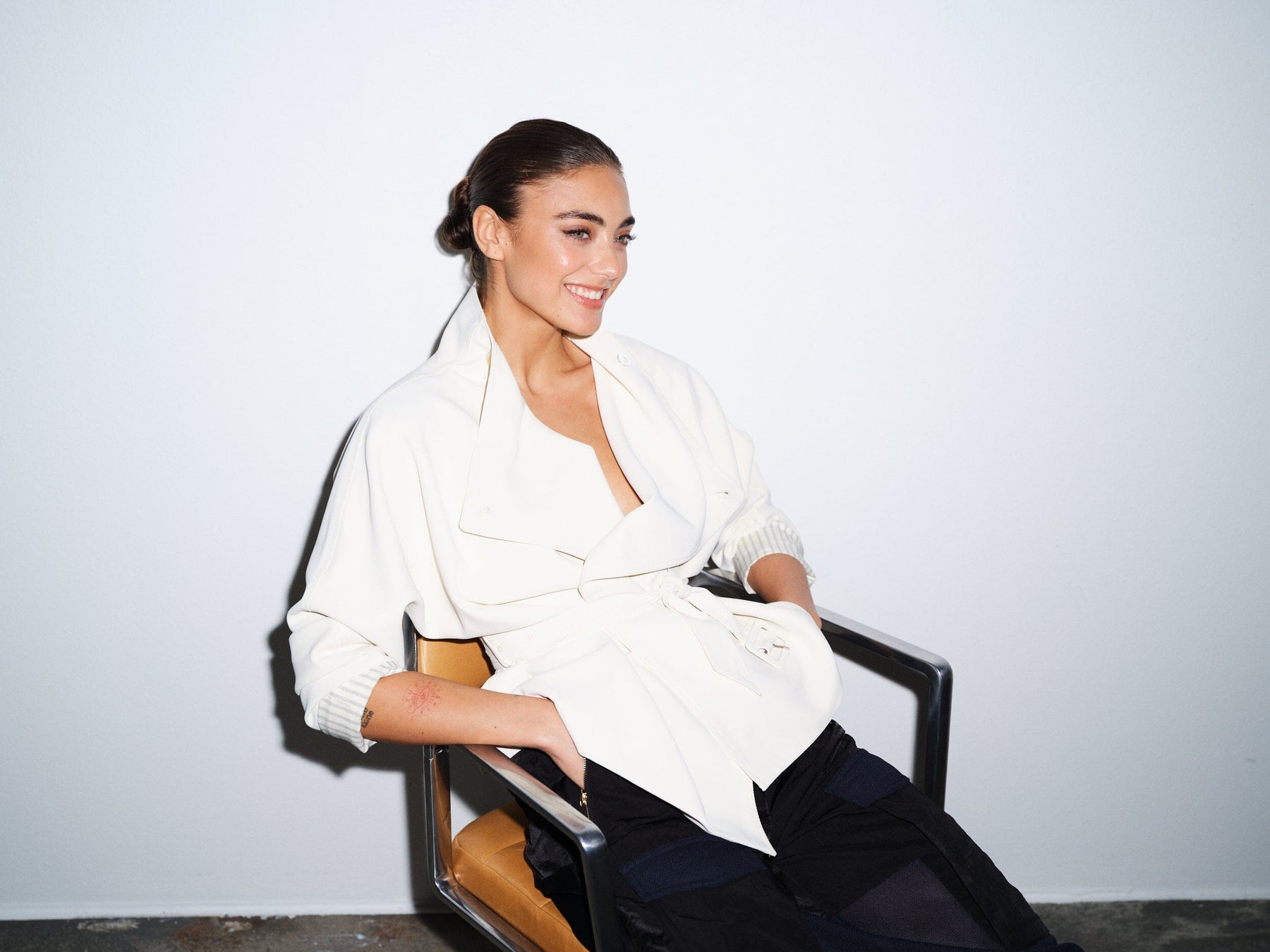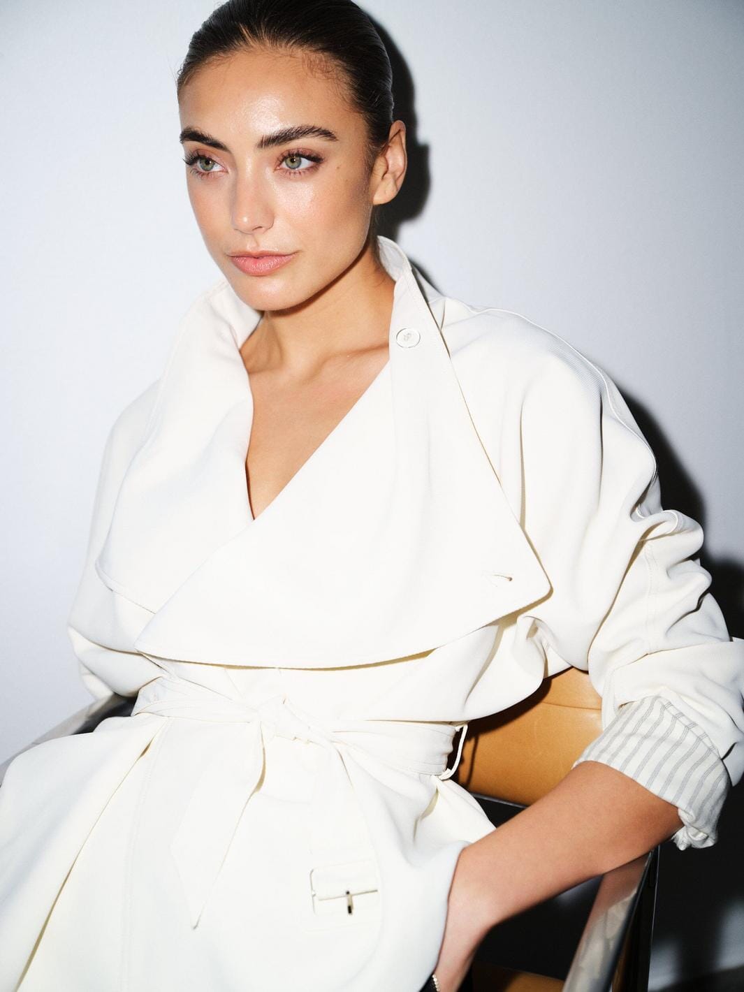 Kremfarget jakke fra Gossia med bredt jakkeslag og belte i livet. Jakken passer til både formelle og avslappede anledninger.