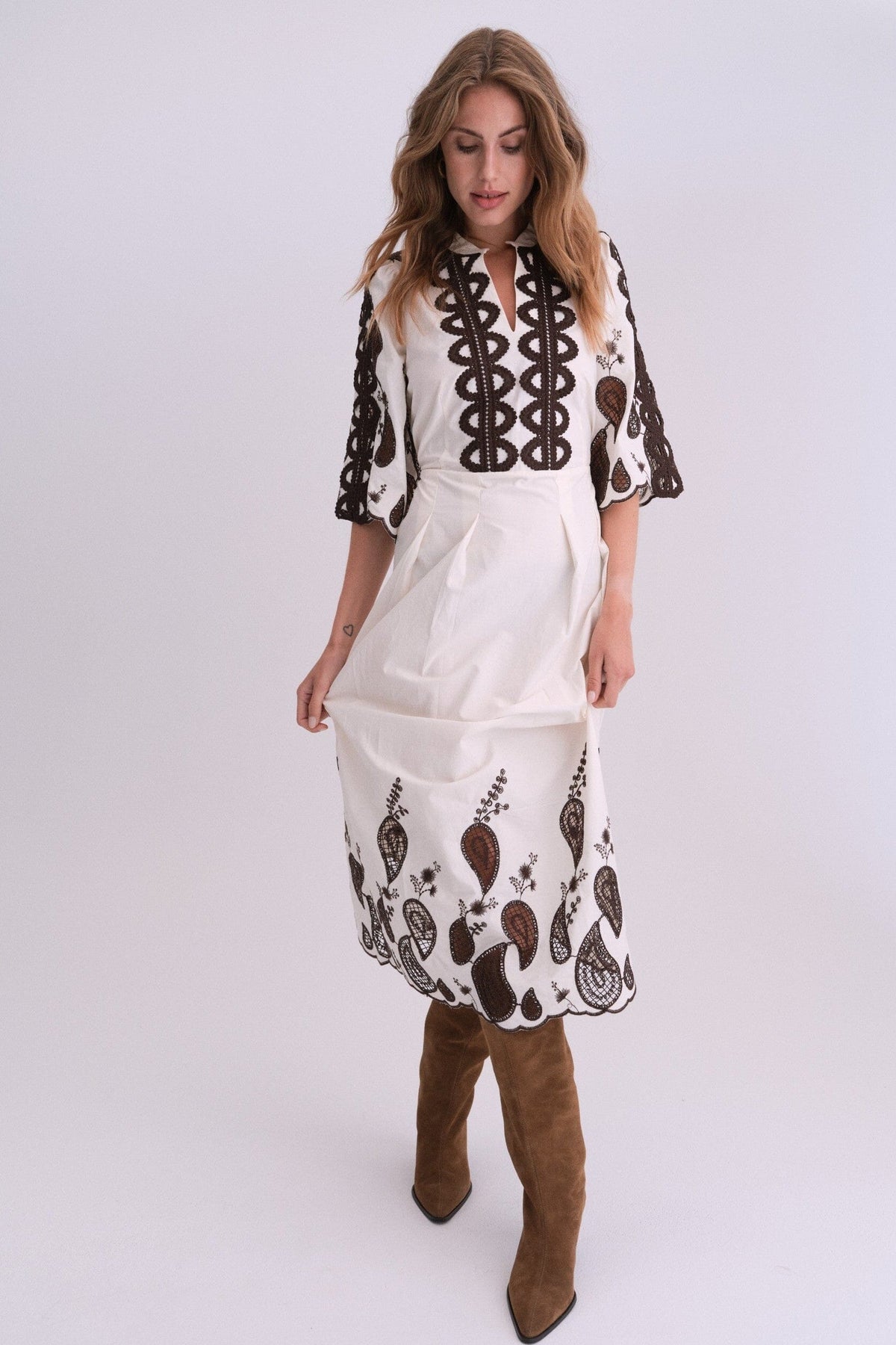 Kremhvit kjole fra Gossia med brunt broderi og blondedetaljer. Kjolen har 3/4 ermer og rekker til midt på leggen. Den runde halsutskjæringen og det blomstrete paisleymønsteret gir kjolen et rustikt uttrykk.