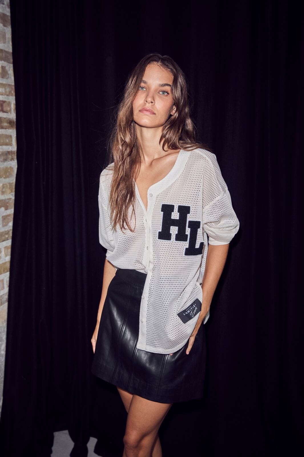 Bluse fra Haute L'Amitié i en hvit perlemorsnyanse. Blusen er laget av et mesh-lignende stoff med svarte HL-bokstaver på venstre bryst.