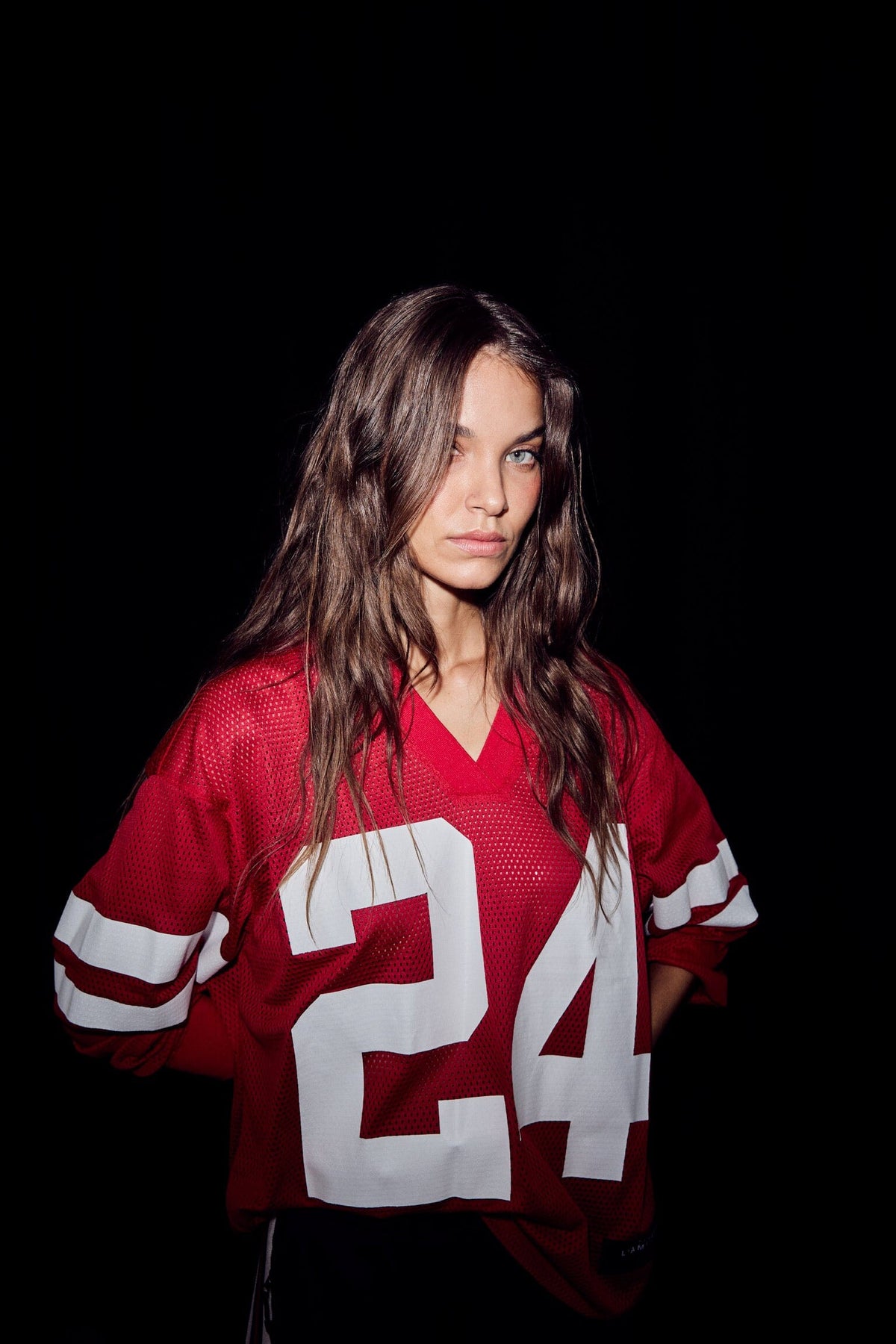 Rød langermet t-skjorte fra Haute L'Amitié med mesh-stoff, stort hvitt nummer 24 på fronten og to hvite striper på ermene.