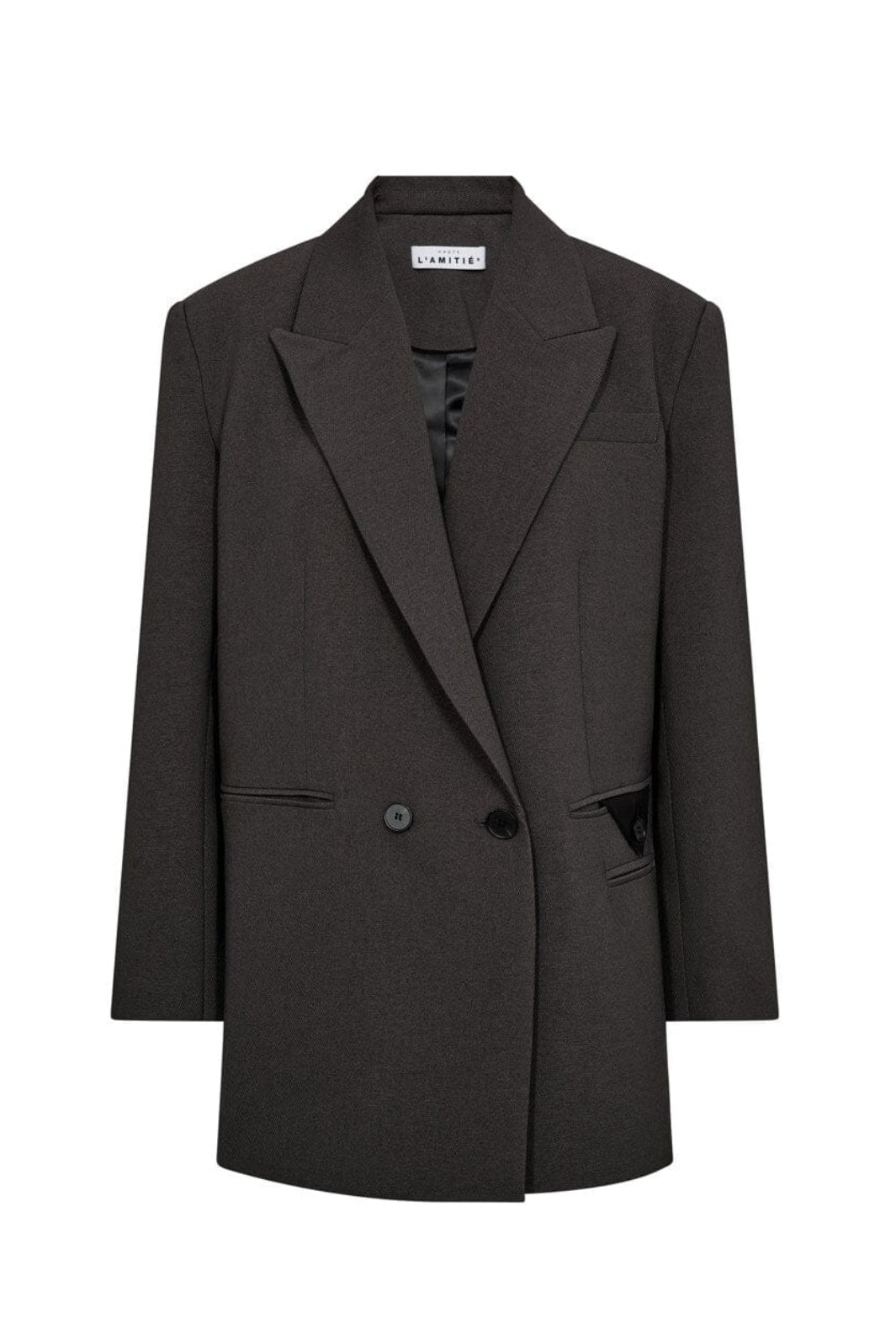 Oversized blazer fra Haute L'Amitié i mørkegrå. Blazeren har en dobbeltspent front med to synlige knapper og brede slag.