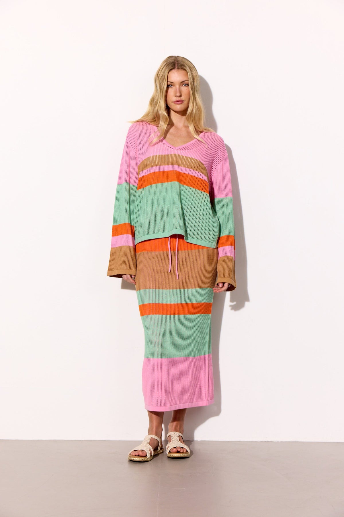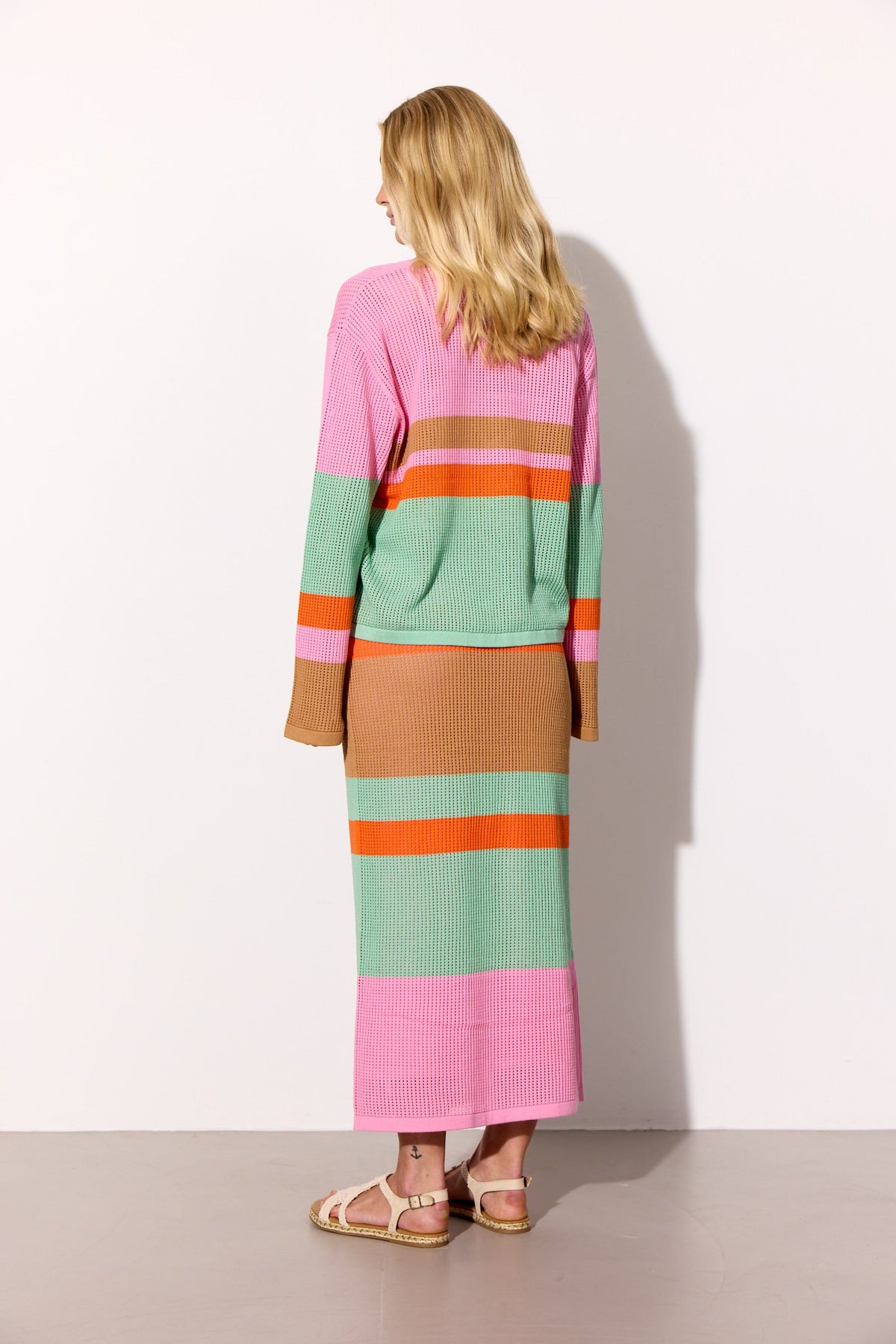 Bluse fra Hunkøn med striper i rosa, mintgrønn, oransje og brun. Den har en mesh-strikket struktur og en løs passform.
