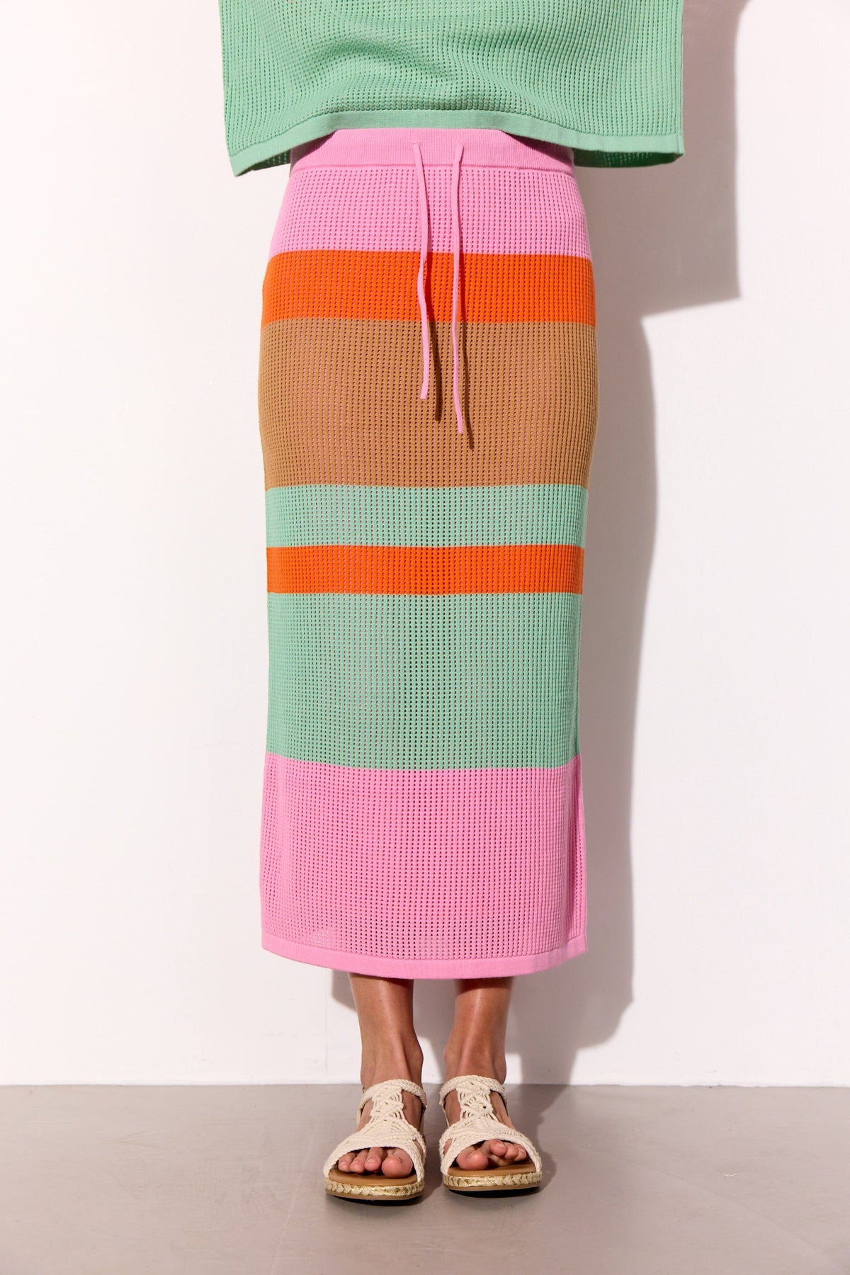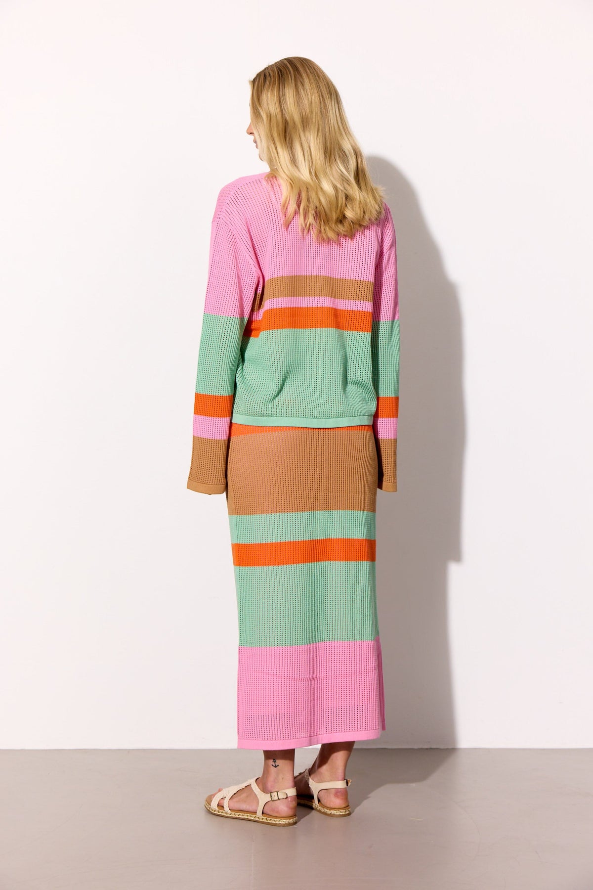 Et stripet skjørt fra Hunkøn i rosa, grønn og oransje. Skjørtet er strikket i 100 % bomull og har lengde til leggen.