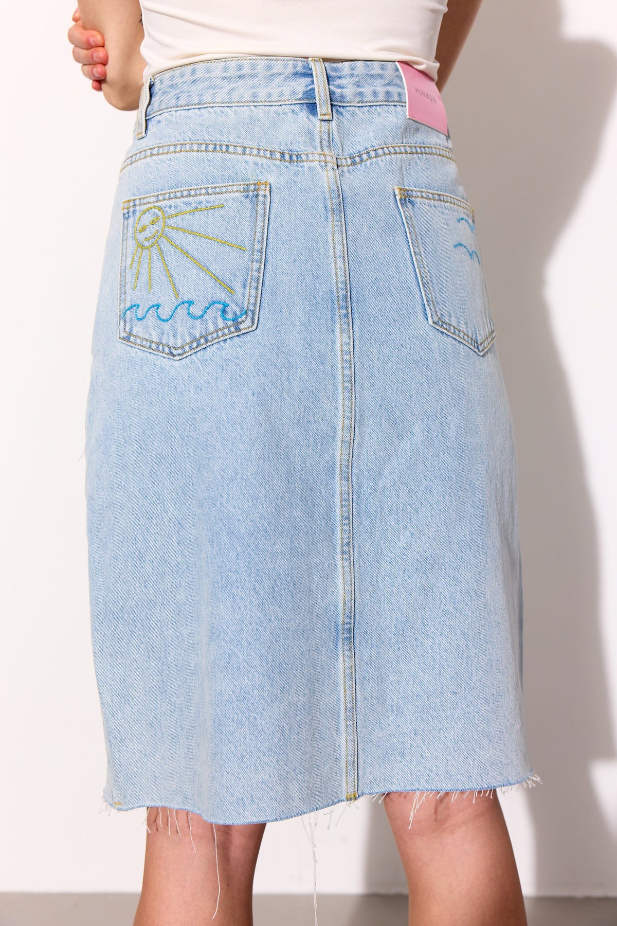 Denimskjørt fra Hunkøn i lys blå denim. Skjørtet har ripped detaljer foran og broderi på baklommene med sol- og bølgemotiv.