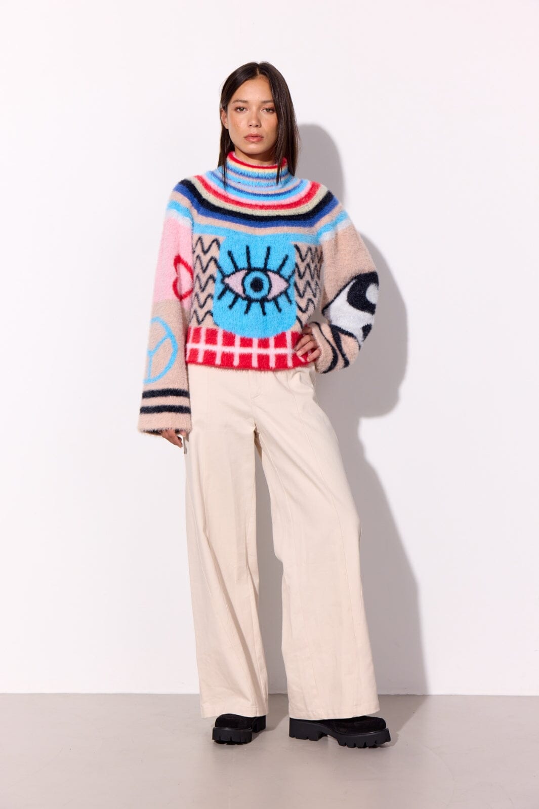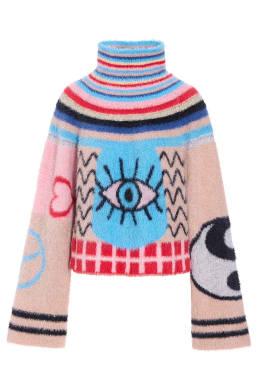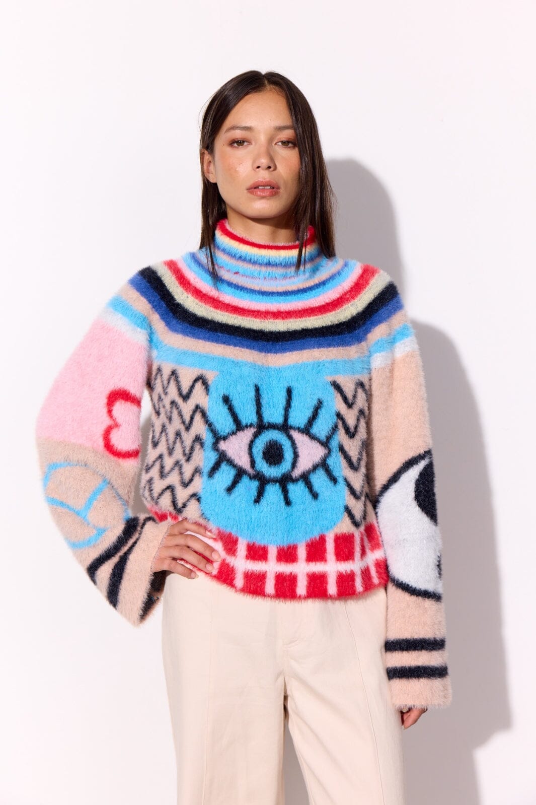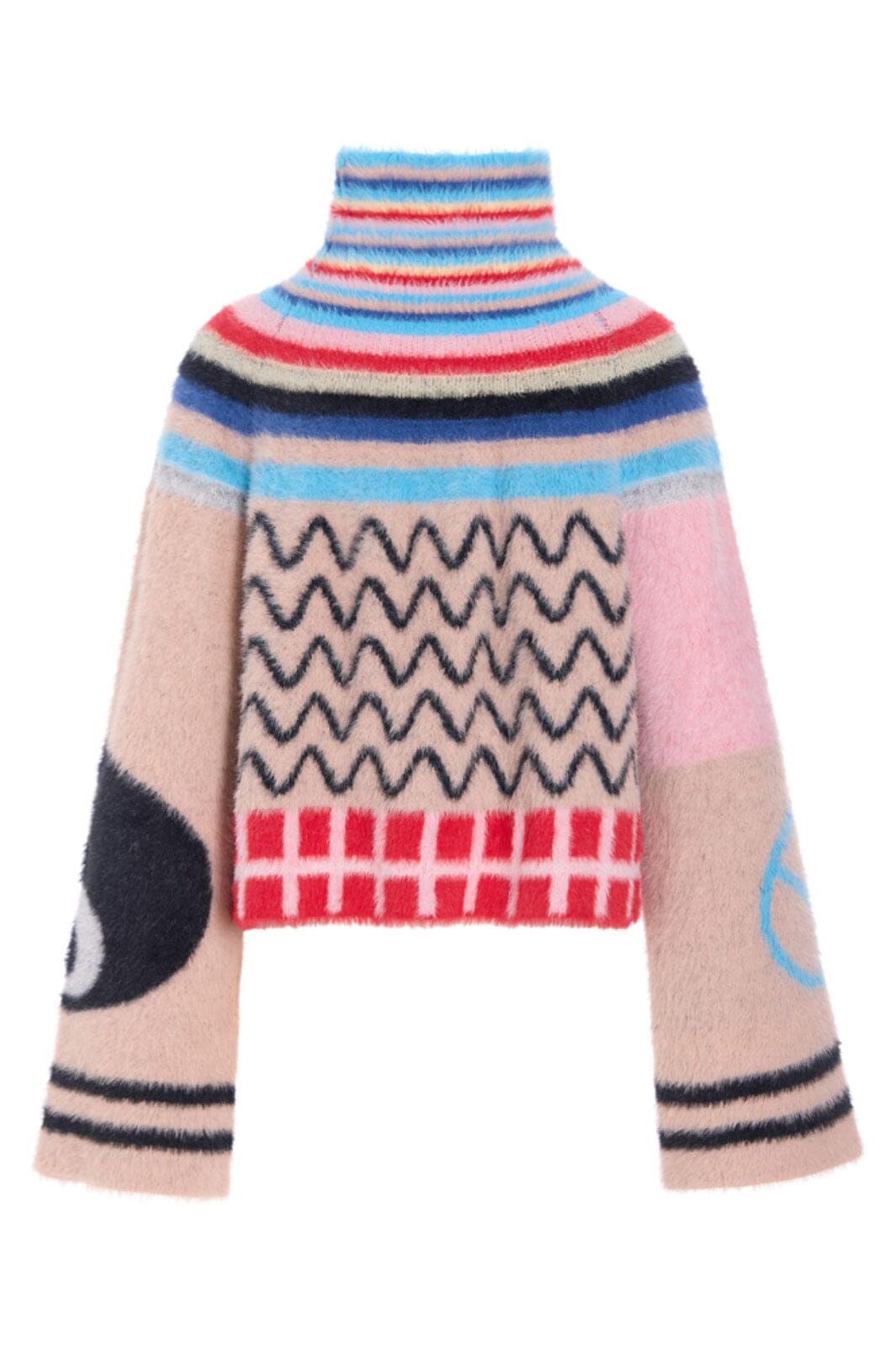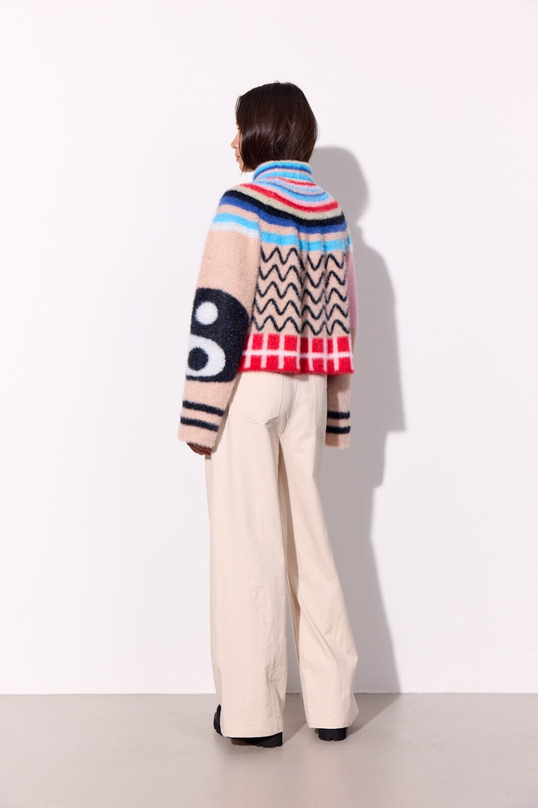 Hunkjønn Kitty Blouse er en kort, myk strikkegenser med et lekent og fargerikt mønster.