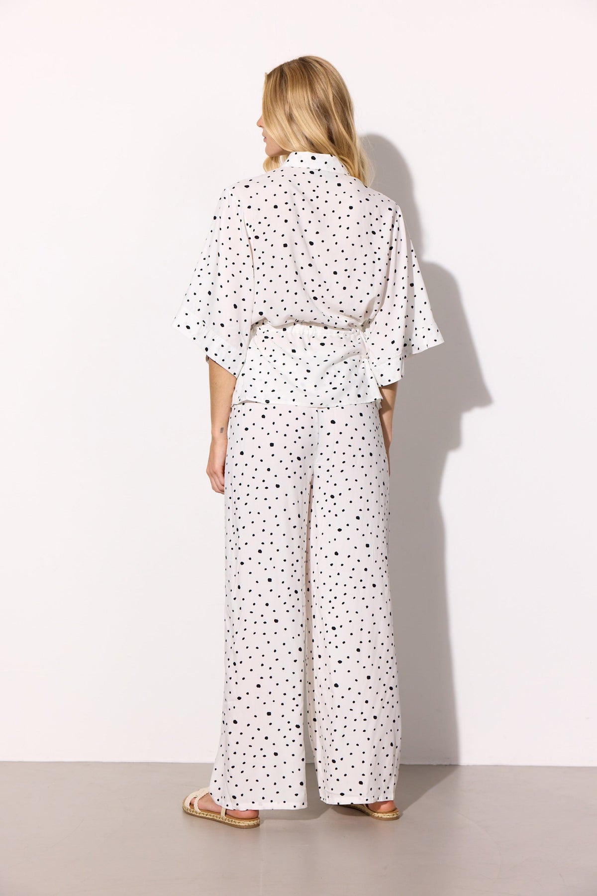 Hvit kimono-skjorte fra Hunkøn med svarte prikker. Skjorten har en klassisk skjortekrage og vide ermer med senkede skuldre.