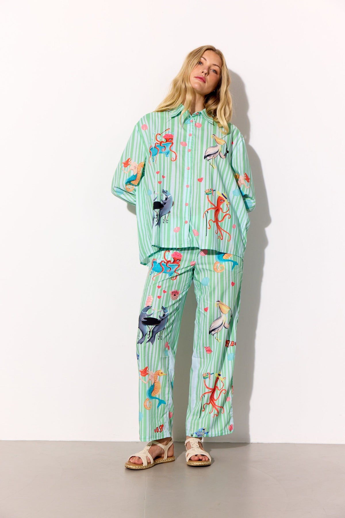 Skjorte fra Hunkøn i Green Ocean Art Print. Det flerfargede mønsteret kombinerer grønne og hvite striper med havinspirerte illustrasjoner av blekkspruter, sjøhester og fugler.