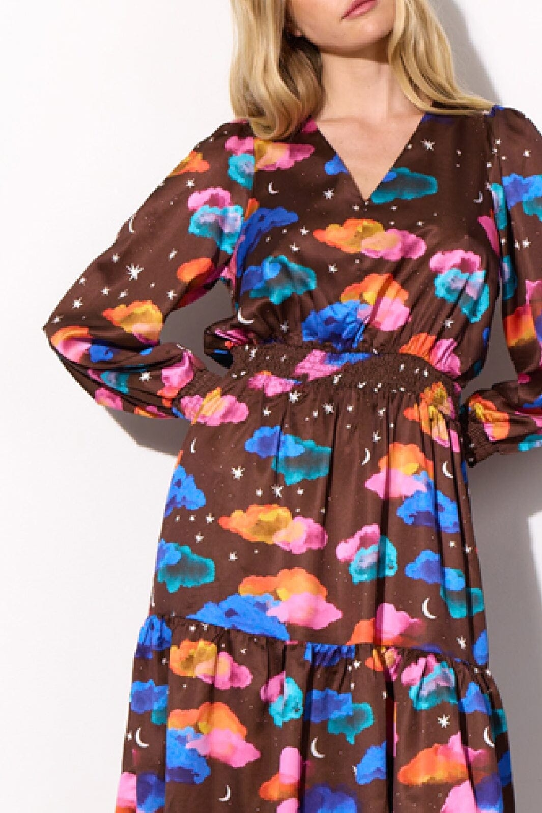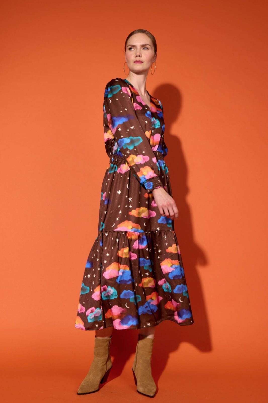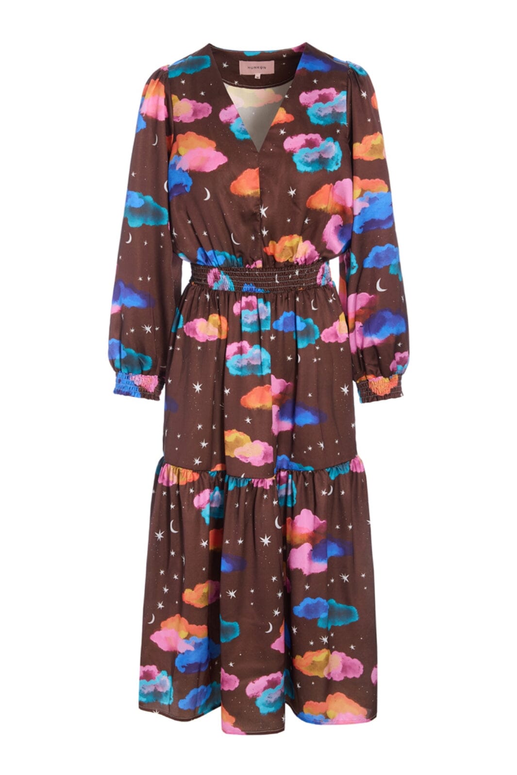 Hunkøn Sonja Dress er en flytende midikjole i vårt Cocoa Sky Art Print.