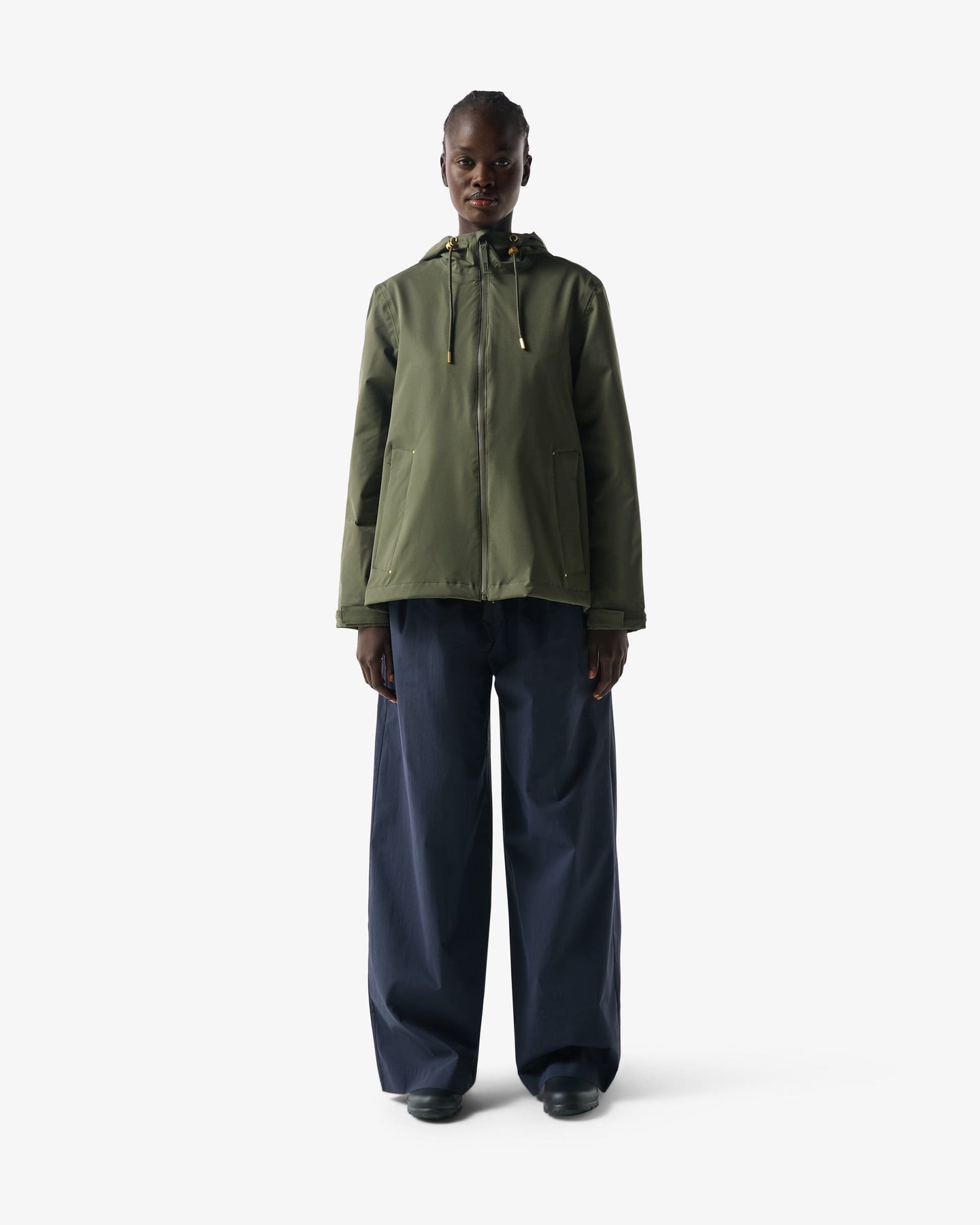 Vanntett jakke fra Hunter, fremstilt i khakigrønn. Jakken har hette med justerbar snøring og glidelås foran.
