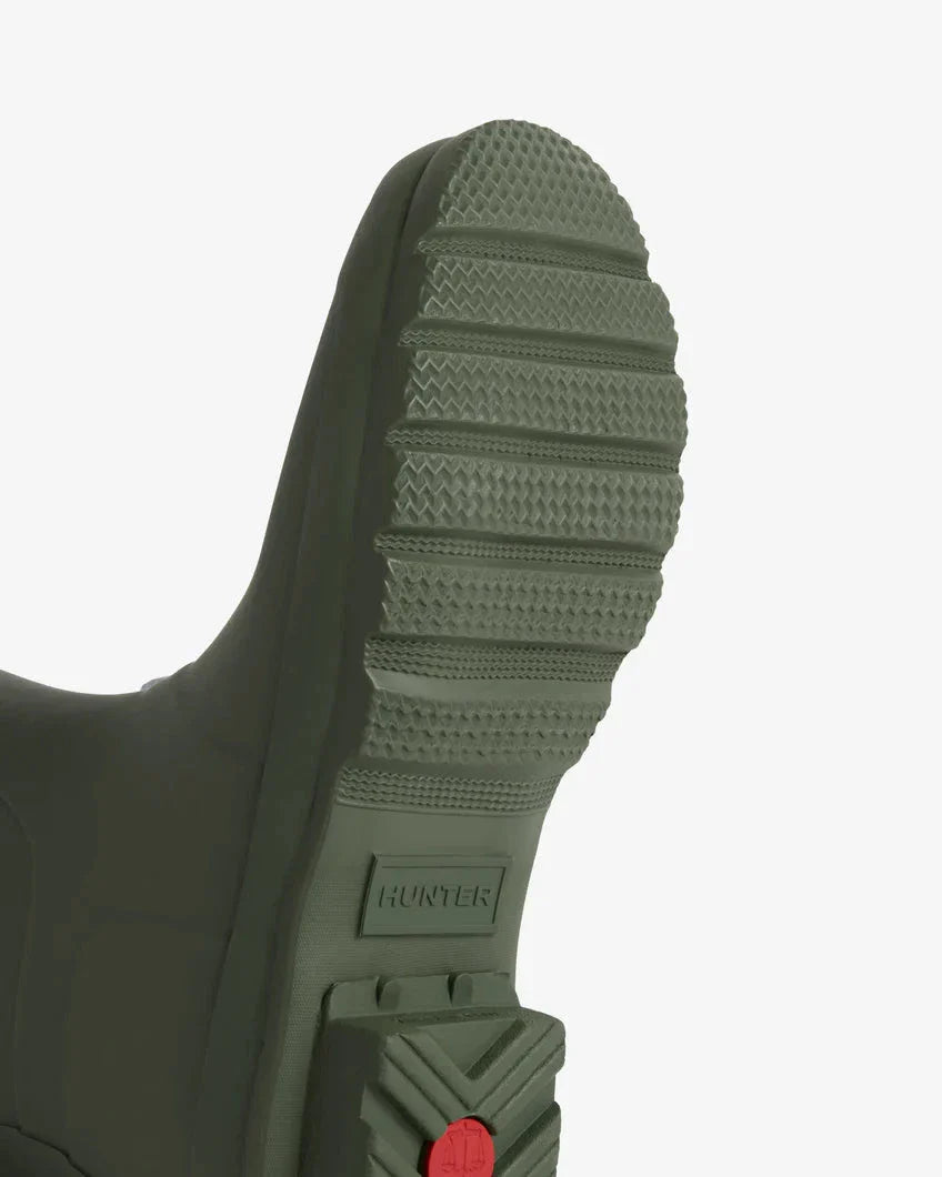 Korte støvler fra Hunter i en mørk olivengrønn farge. Støvlene er laget av gummi og har et klassisk design med Hunter-logoen synlig foran.