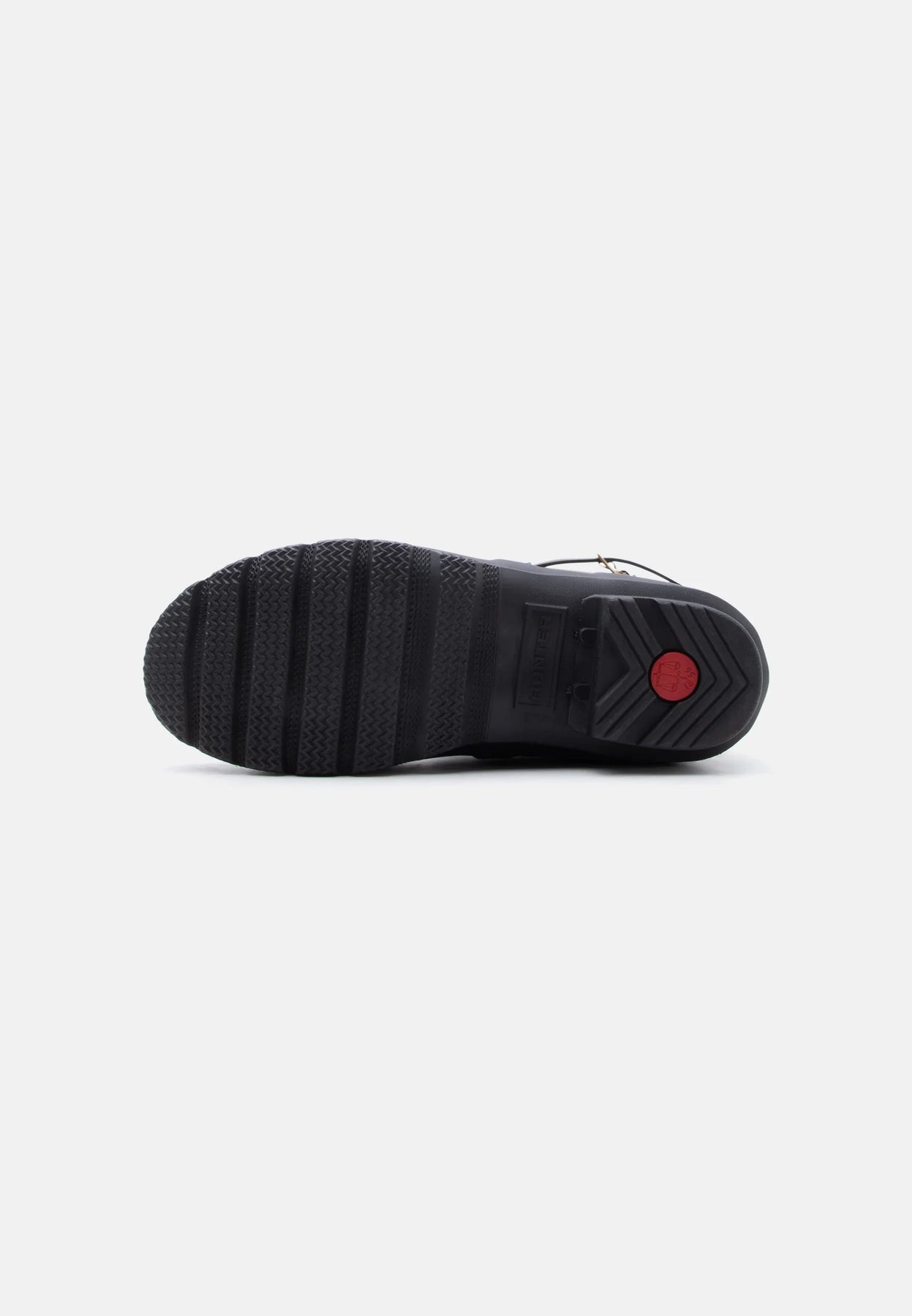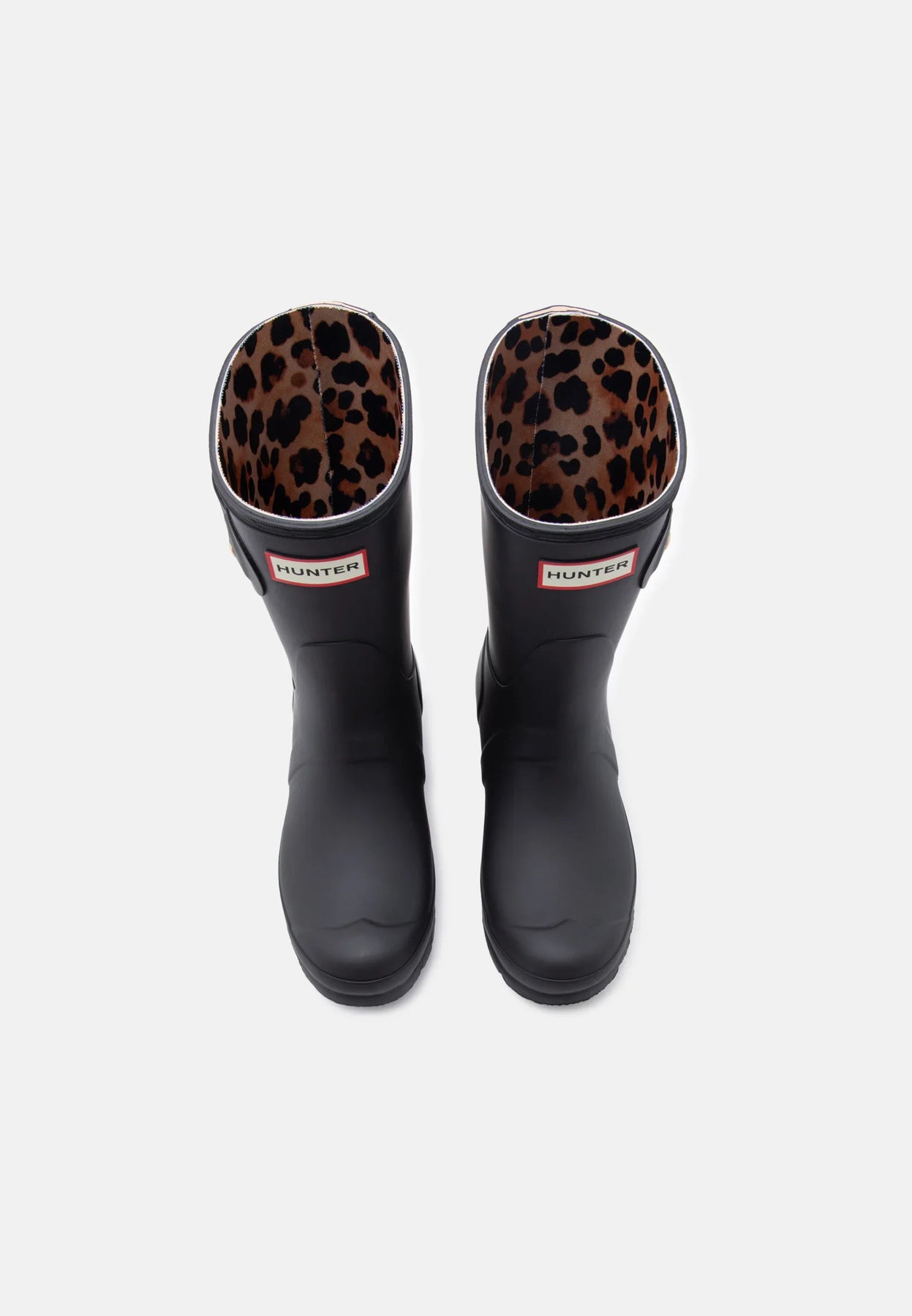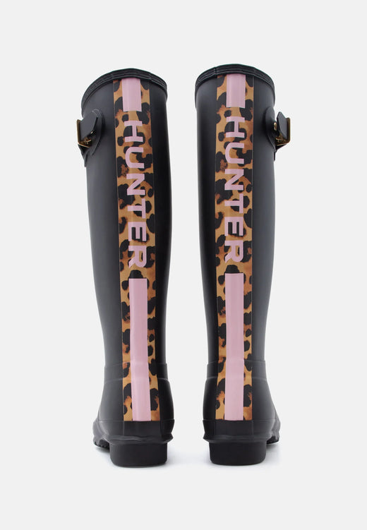 Svarte gummistøvler fra Hunter med leopardmønstret stropp på baksiden. Støvlene er laget av 100 % gummi og har en spenne som lukking.