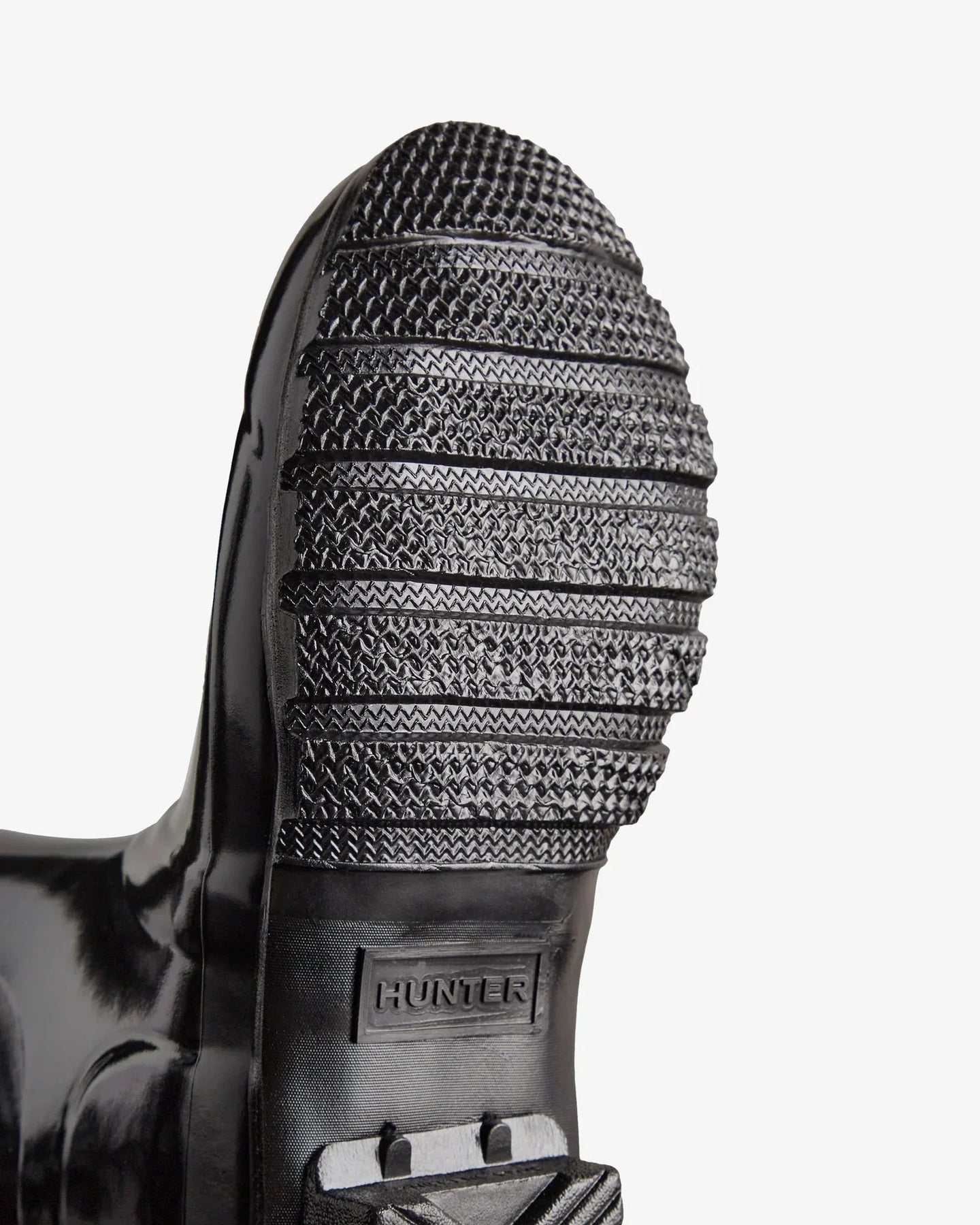Høye støvler fra Hunter i svart med en blank overflate. Støvlene er laget av gummi og har en justerbar rem med metallspenne.