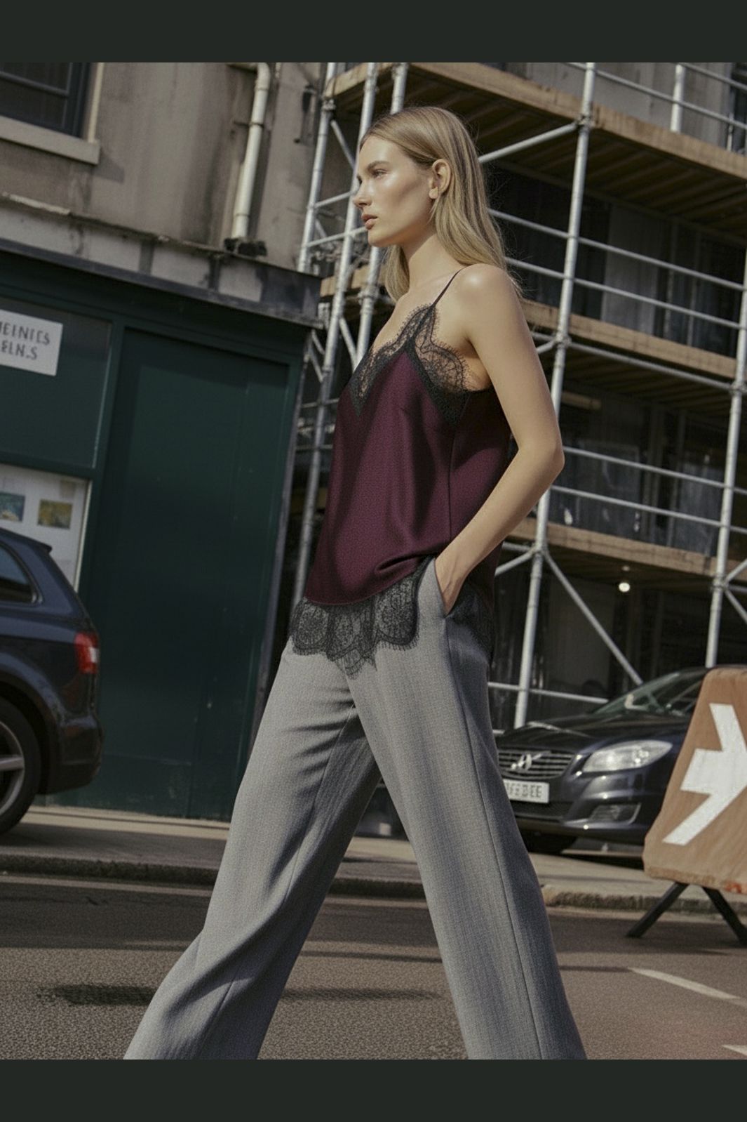 Satin topp fra Hypedrop i dyp lilla. Toppen har en V-utringning med svart blondekant og tynne stropper. Den løse passformen gir god bevegelsesfrihet.