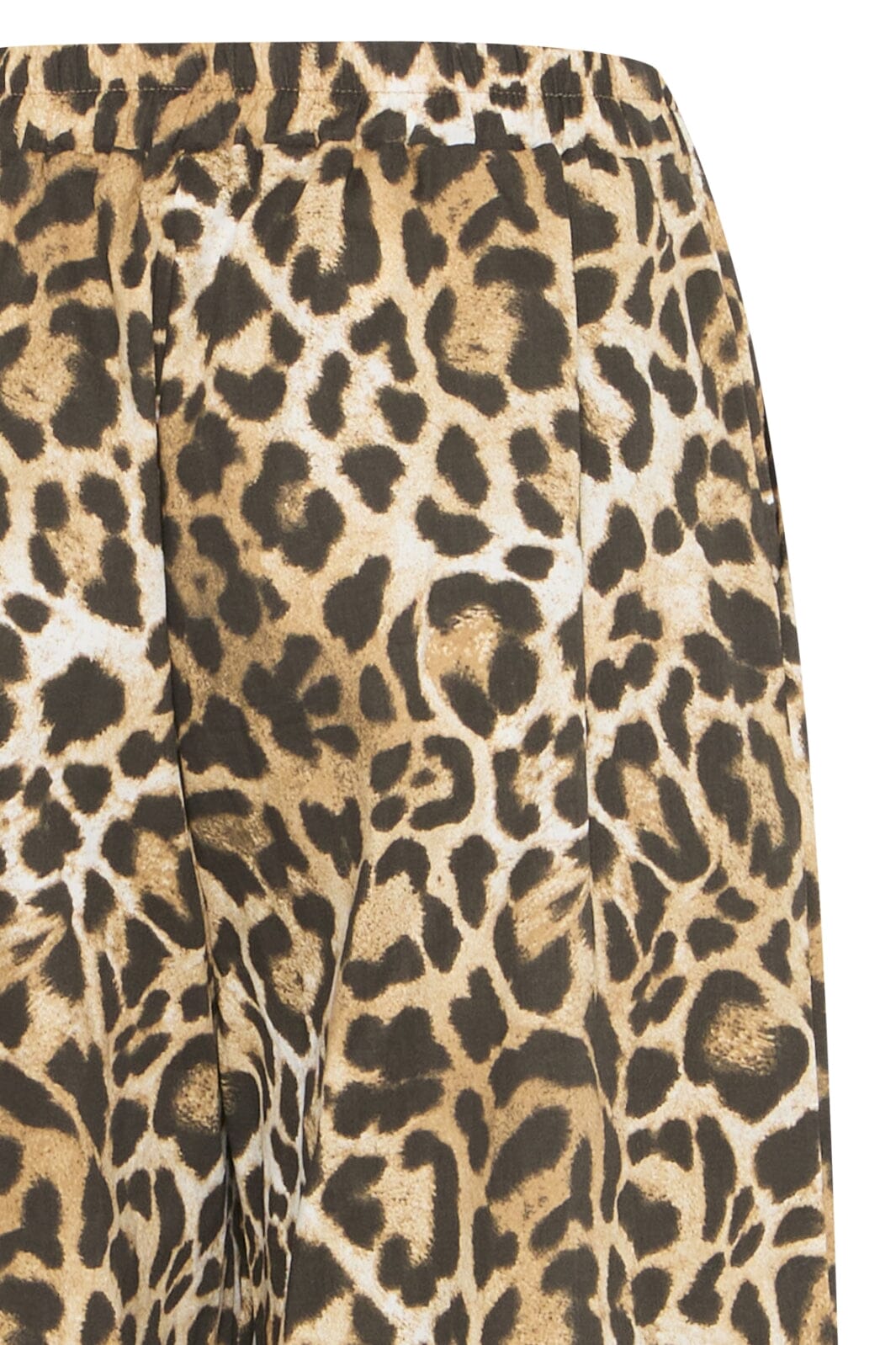Bukser fra Ichi med leopardmønster i beige og brune nyanser. De har vide ben og ankellengde med en elastisk midje som gjør dem enkle å ta på og av.