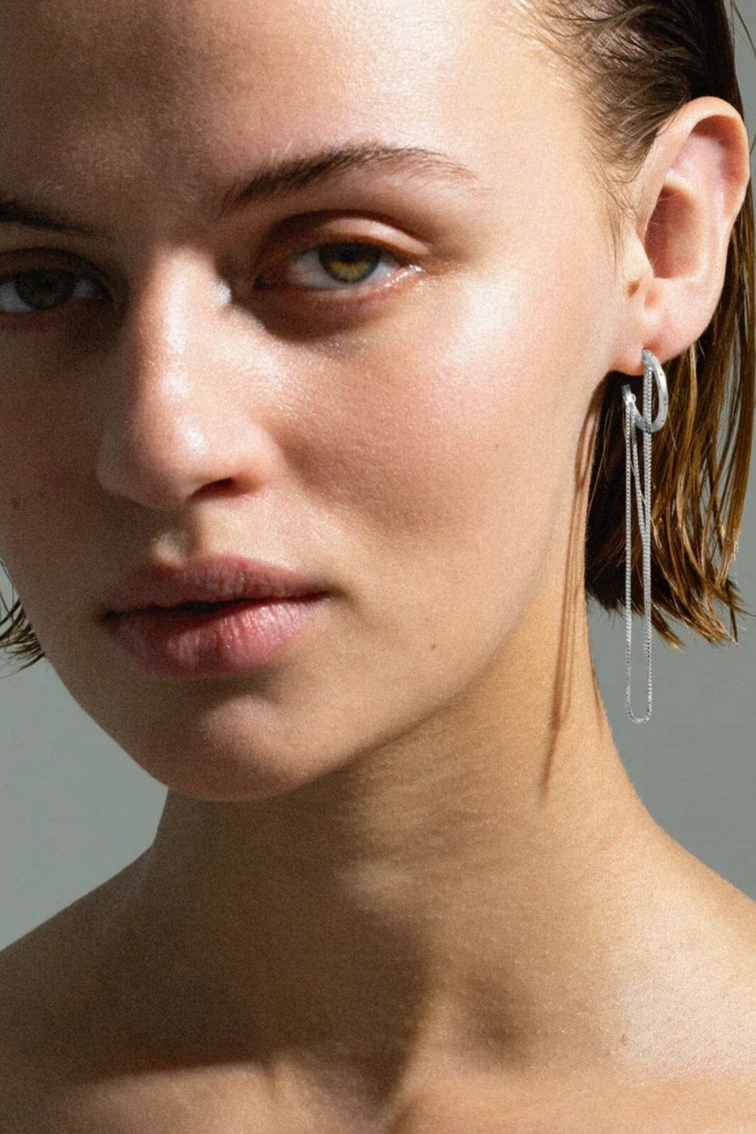 Sølvfarget ørepynt fra Jane Kønig med en rund form og en hengende kjede. Ørepynten kombinerer en enkel sirkel med en lang kjede i et rent design.