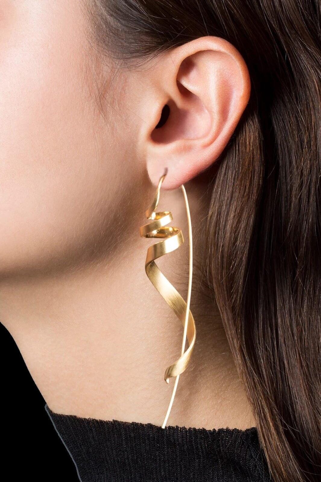 Forgylt øredobb med vridd design. Den skulpturelle formen er laget av 925 sterling sølv med en gyllen overflate. Øredobben har en lang, svingete form.