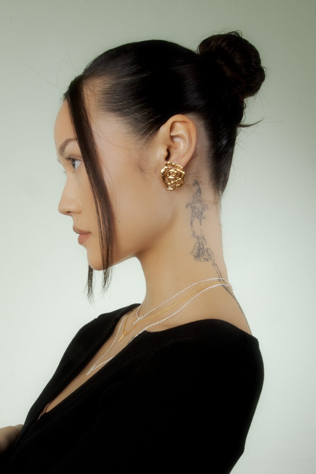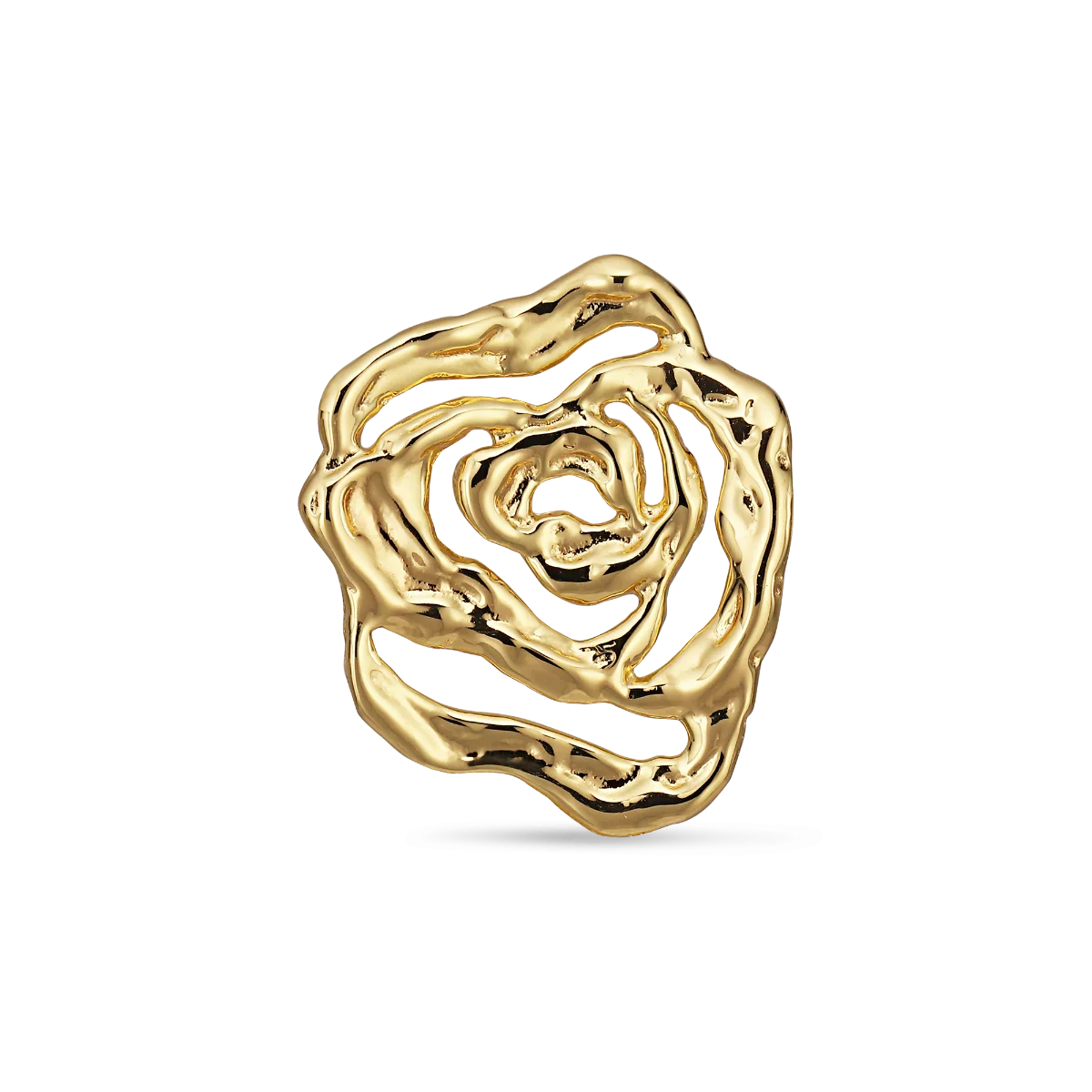 Forgylt øredobb fra Jane Kønig med en tredimensjonal roseform. Øredobben har skulpturelle blader med fine detaljer og en blank, gylden overflate.