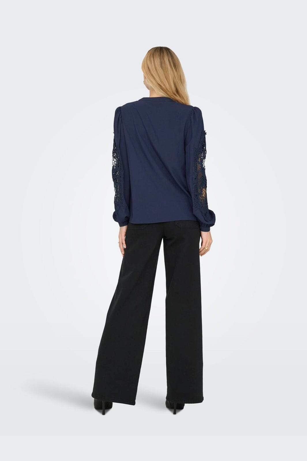 Mørkeblå skjorte fra JDY, laget av 70% viskose og 30% nylon. Skjorten har klassisk skjortekrage og lange ermer med blondedetaljer på ermene. Regular fit gir en behagelig passform.