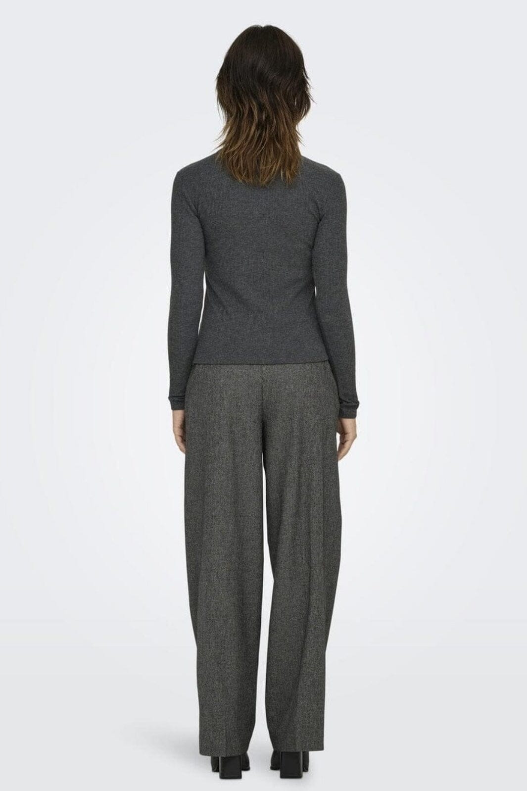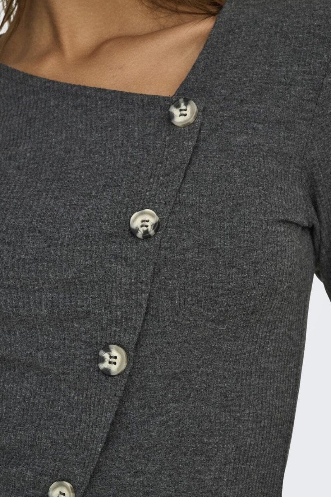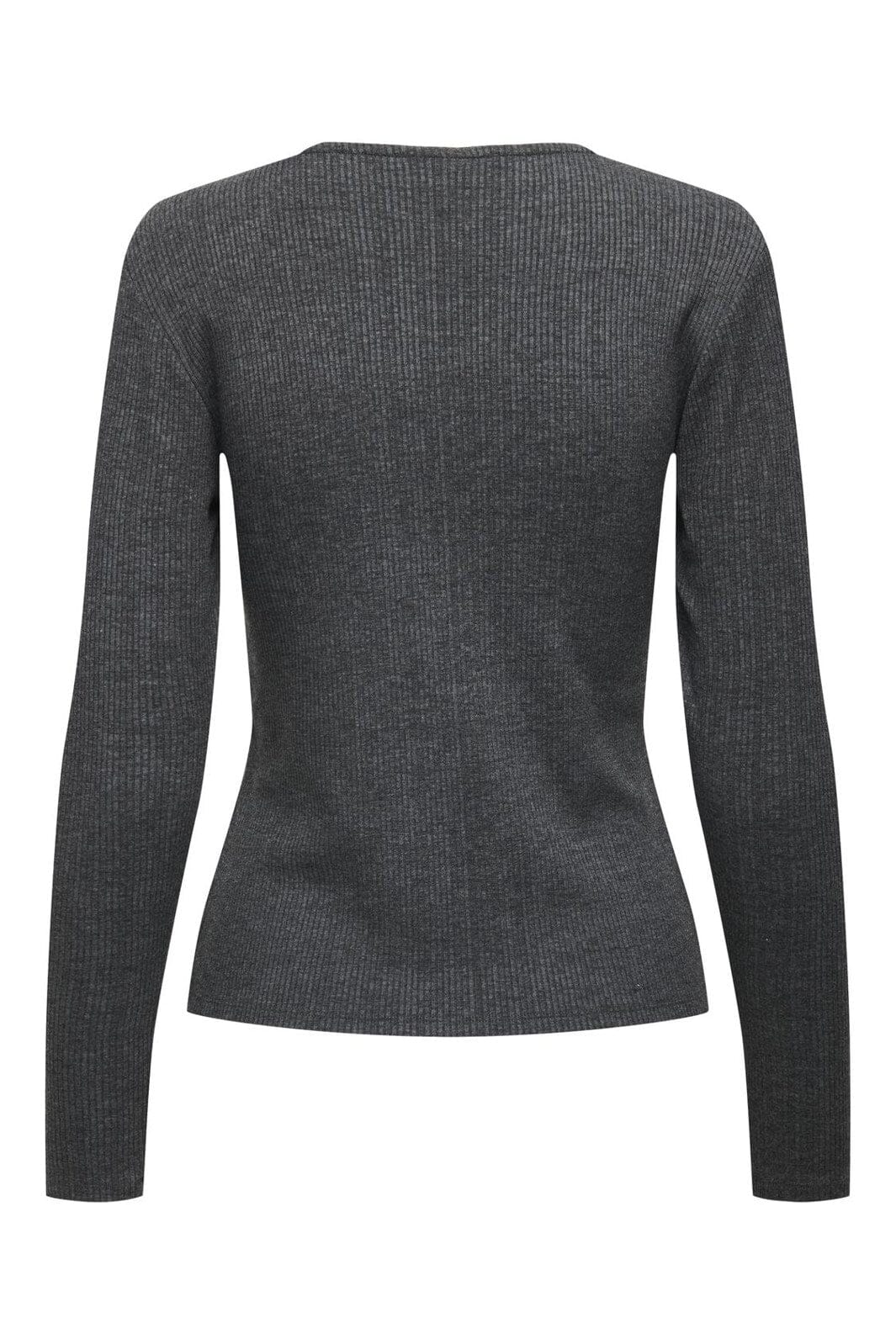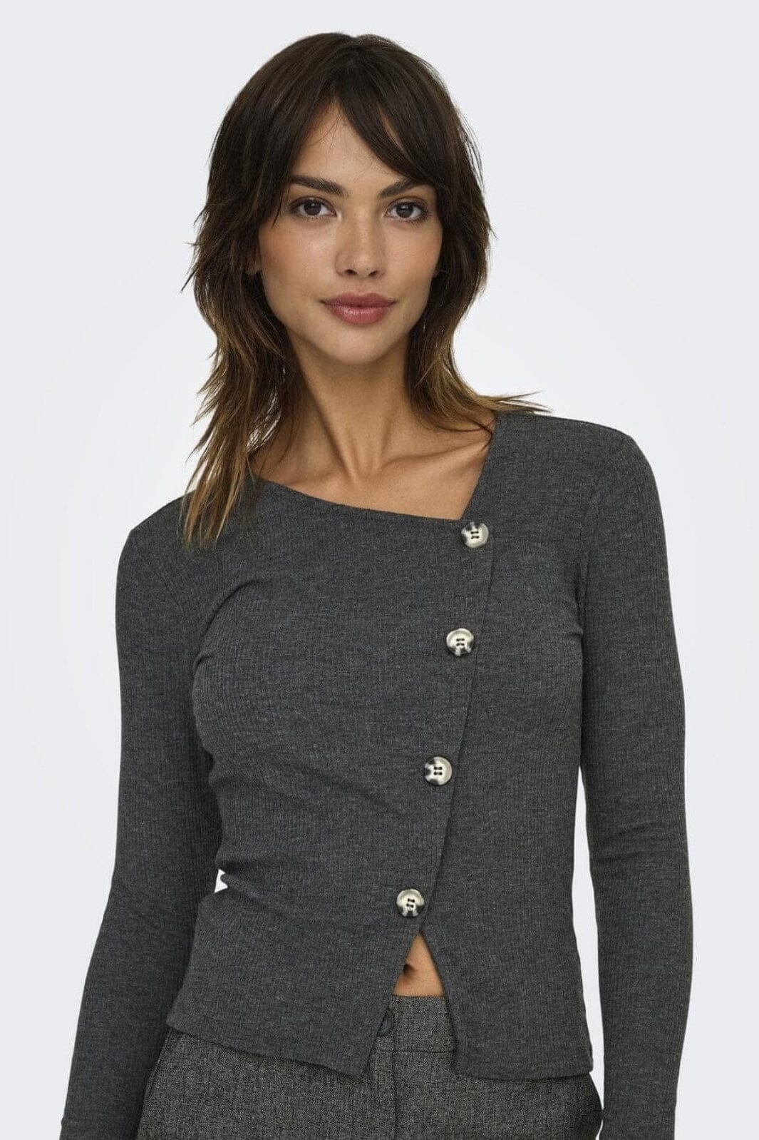 Mørk grå topp fra JDY med lange ermer og asymmetrisk knappelukking. Den ribbede strukturen gir toppen en god passform, mens den gråmelange nyansen er lett å style.