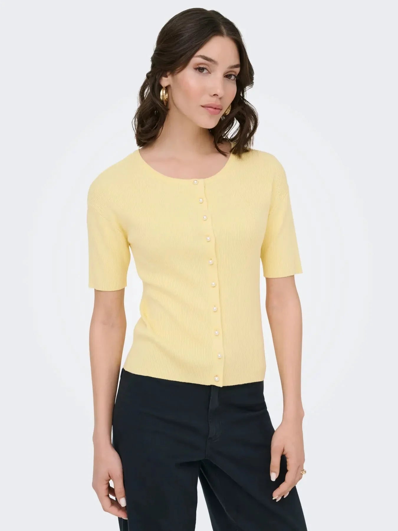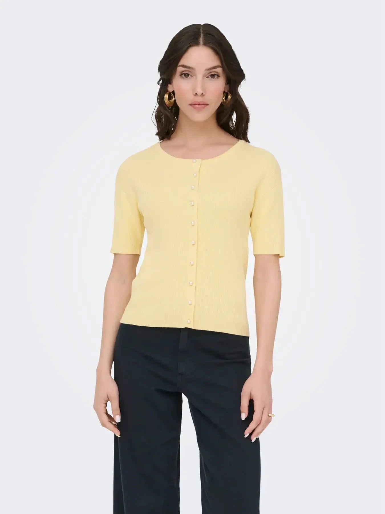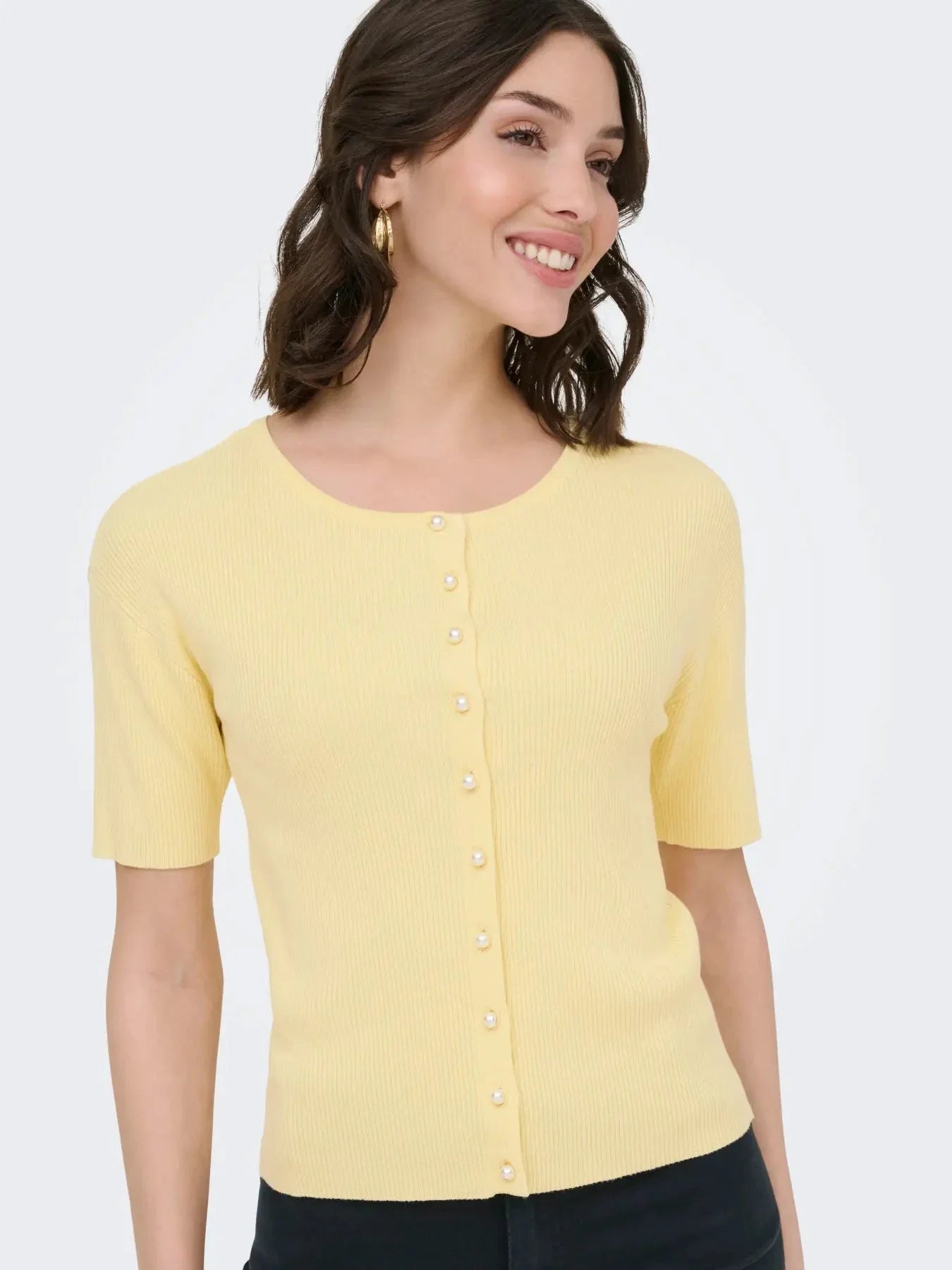 Lys kremfarget cardigan fra JDY med korte ermer og perleknapper langs fronten. Cardiganen har en rund halsutringning og en slim fit-passform.