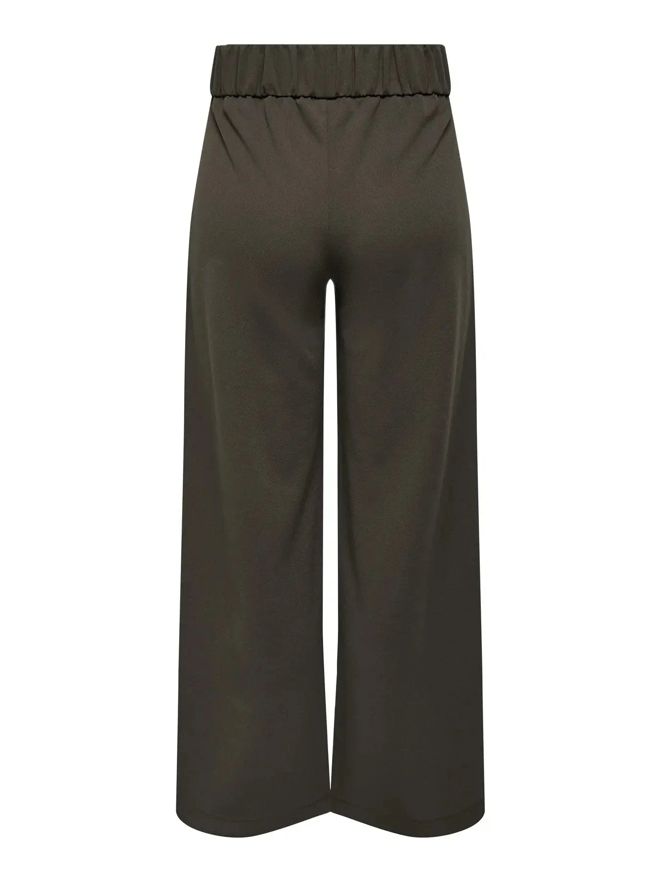Sjokoladebrune bukser fra JDY med svarte knapper. Buksene har en løs passform med vide ben og høy midje.