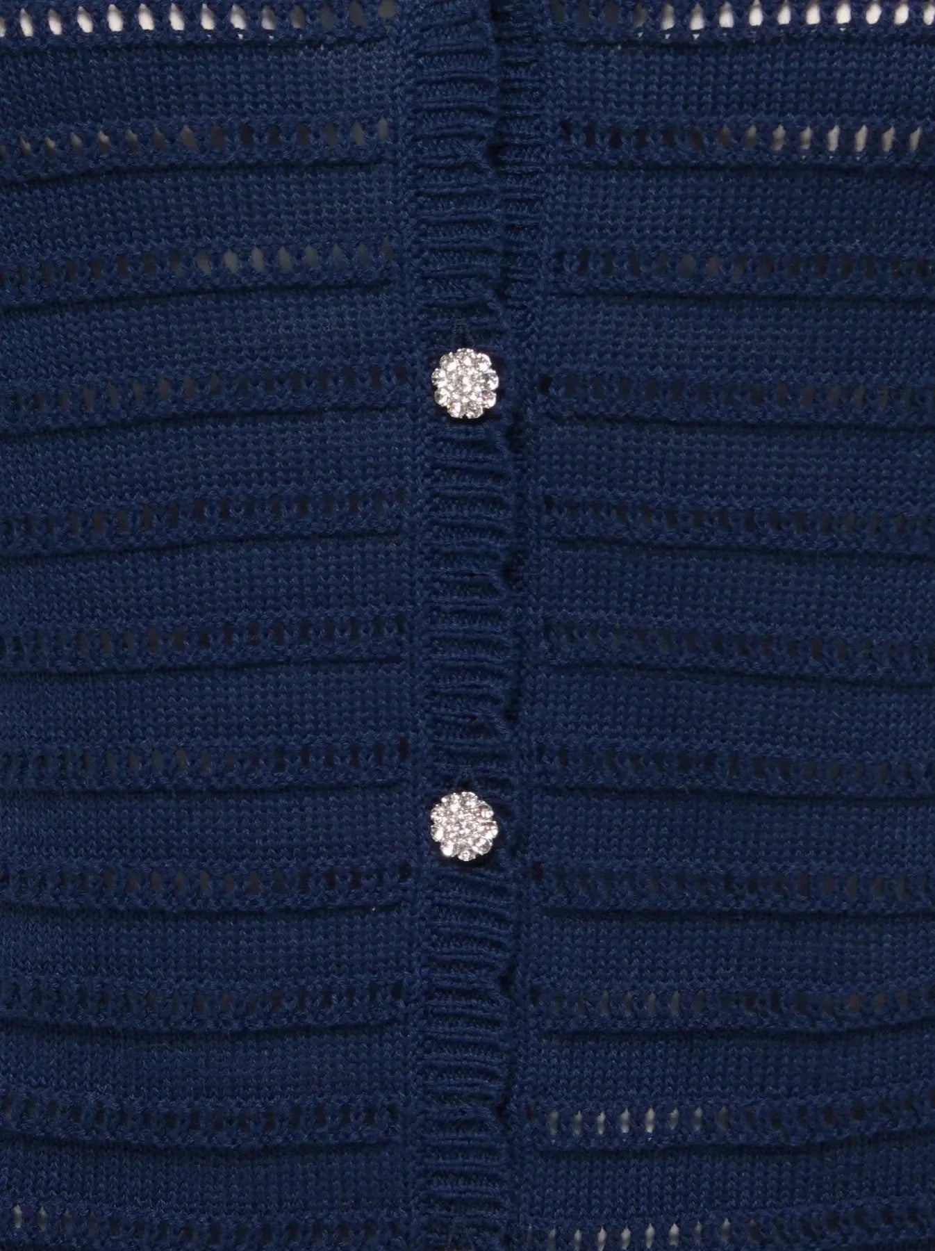 En mørkeblå cardigan fra JDY med åpent strikket mønster og korte ermer. V-utringningen og de glitrende knappene gir cardiganen et feminint uttrykk.