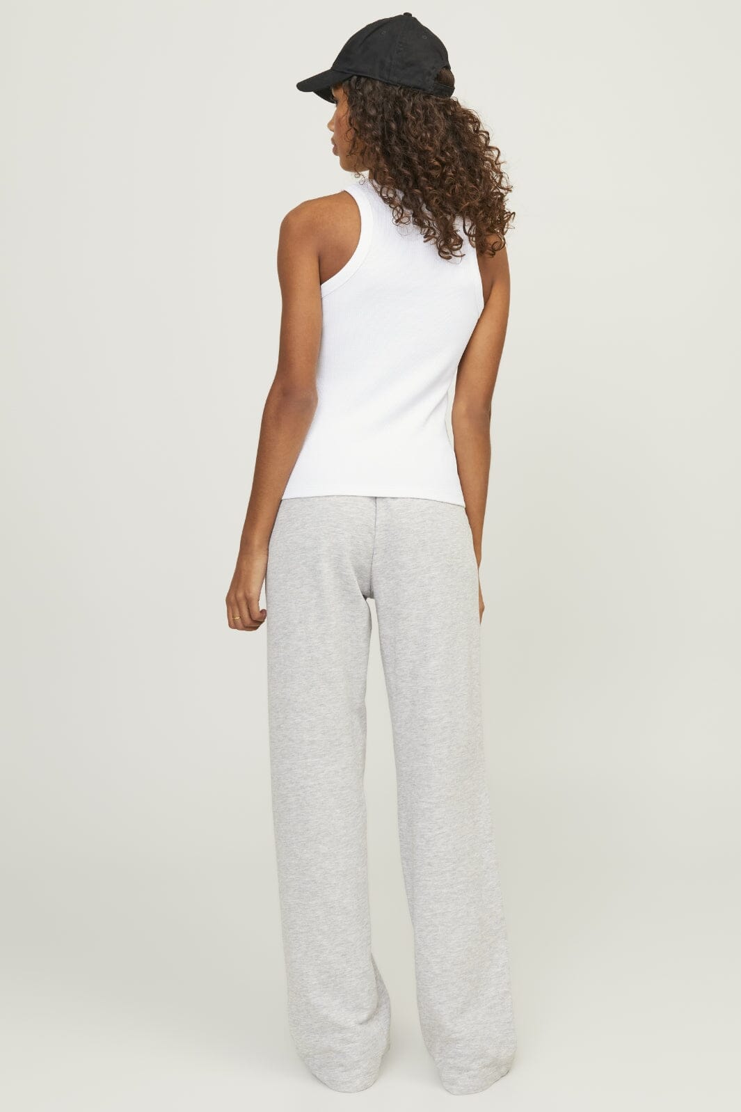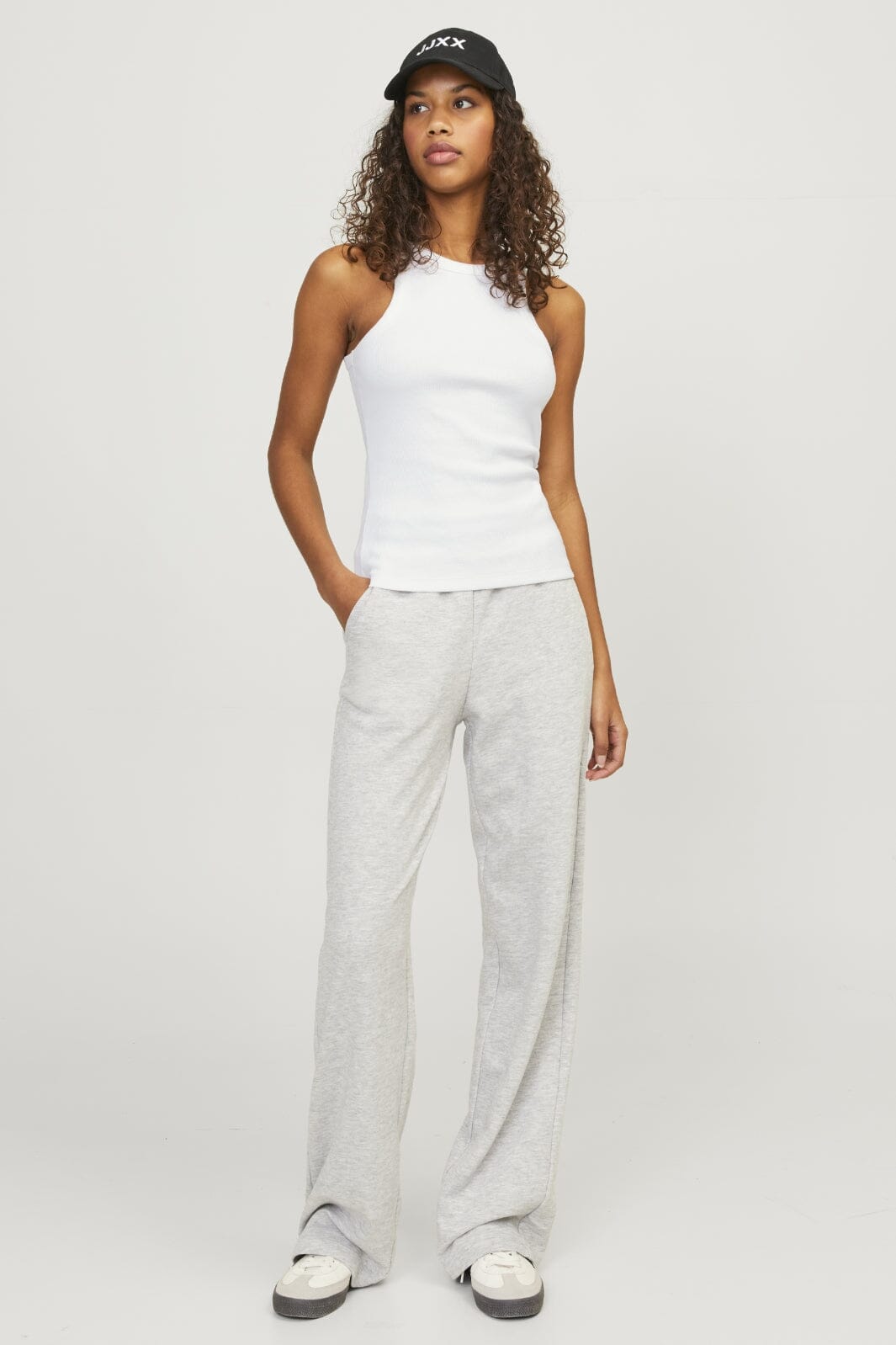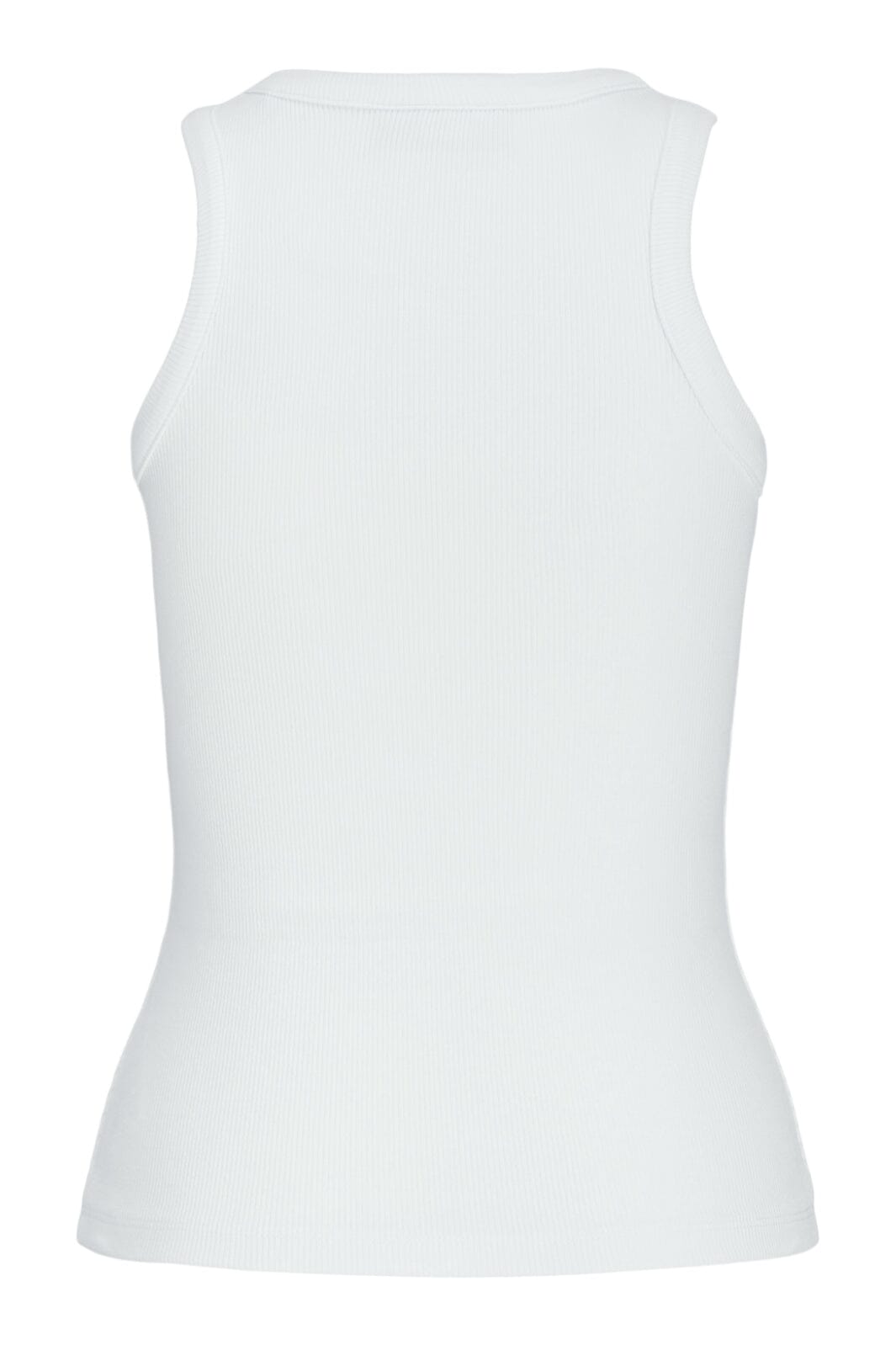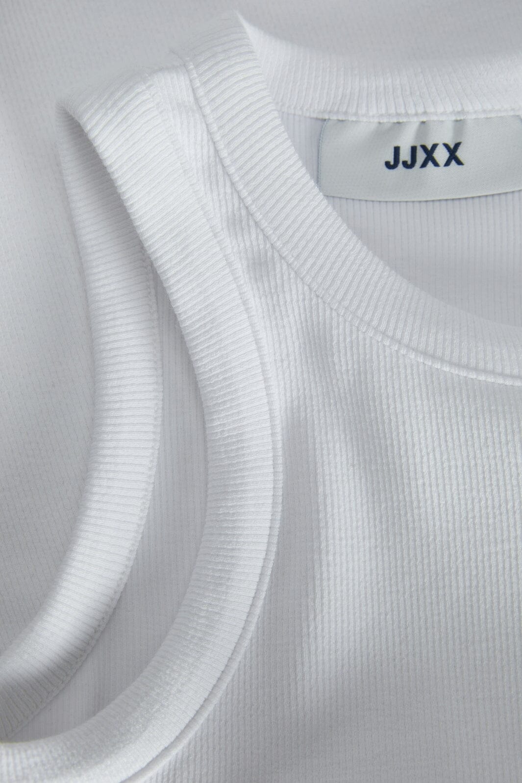 Hvit ribbestrikket topp fra Jjxx med tettsittende passform. Den ermeløse toppen har en rund halsutskjæring og er laget av en myk bomullsblanding med stretch.