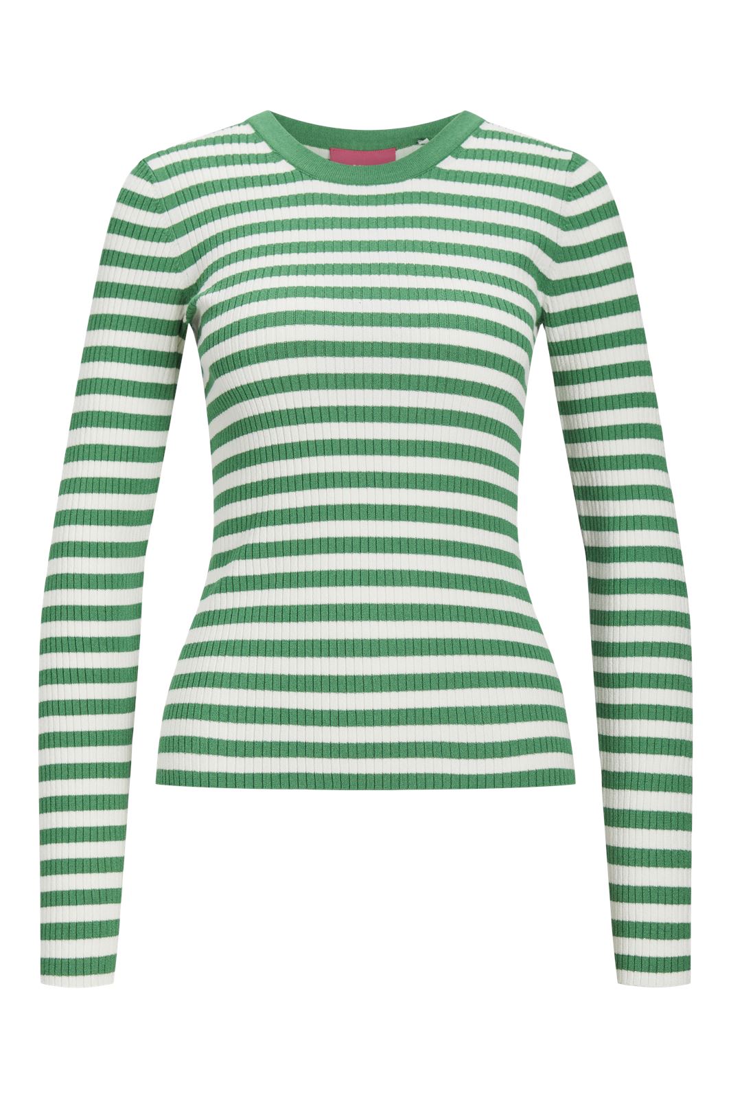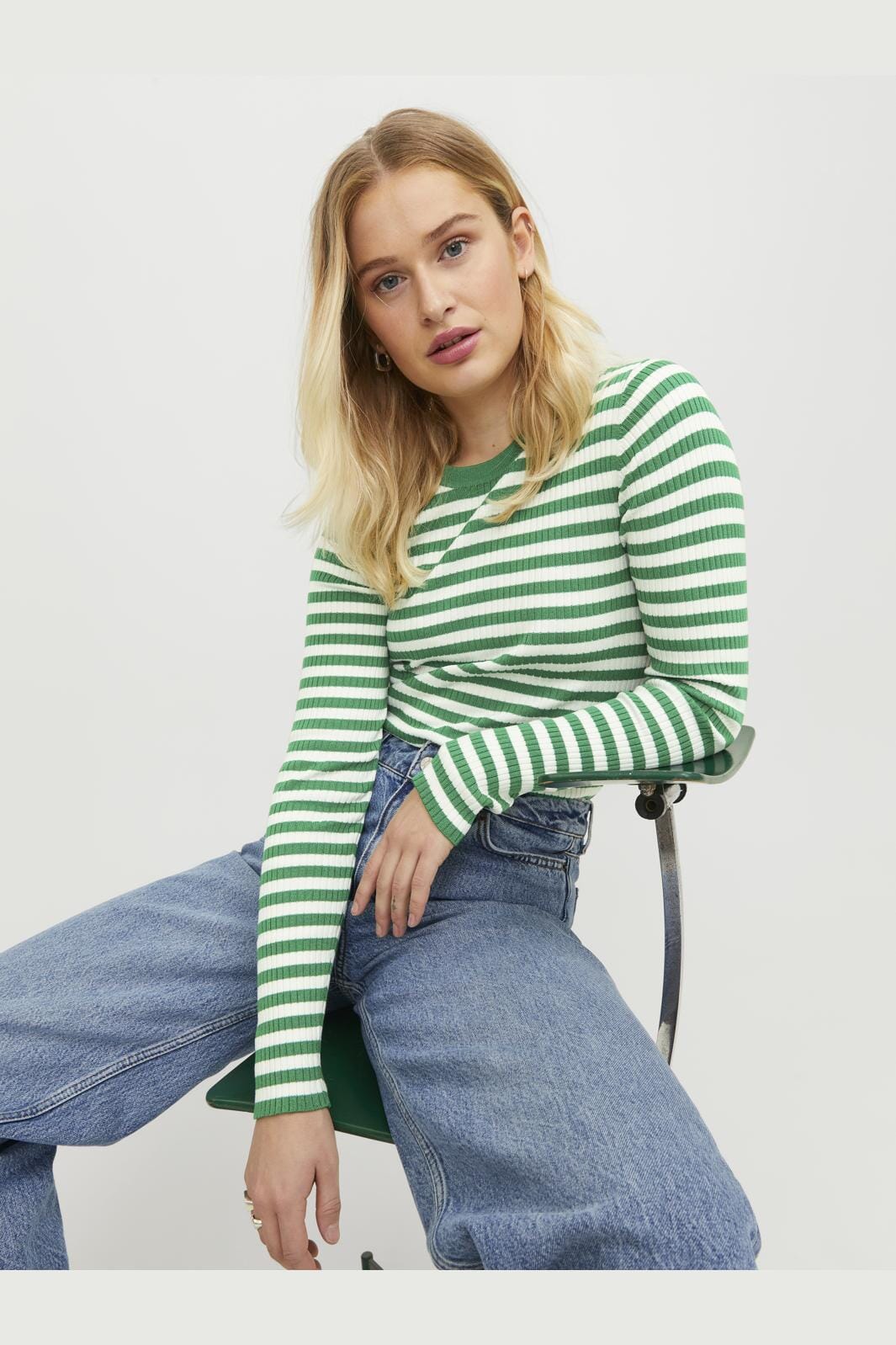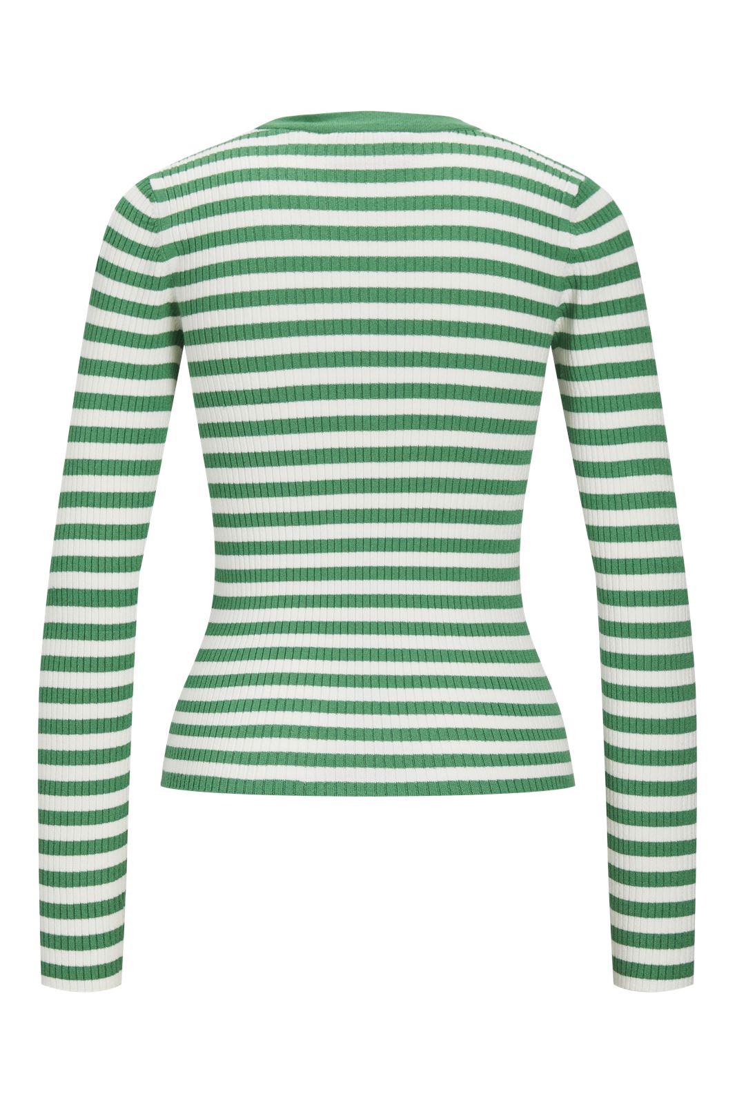 Strikketopp fra Jjxx i ribbestrikk med grønne og hvite horisontale striper. Den har en rund halsutskjæring og lange ermer med en tettsittende passform.