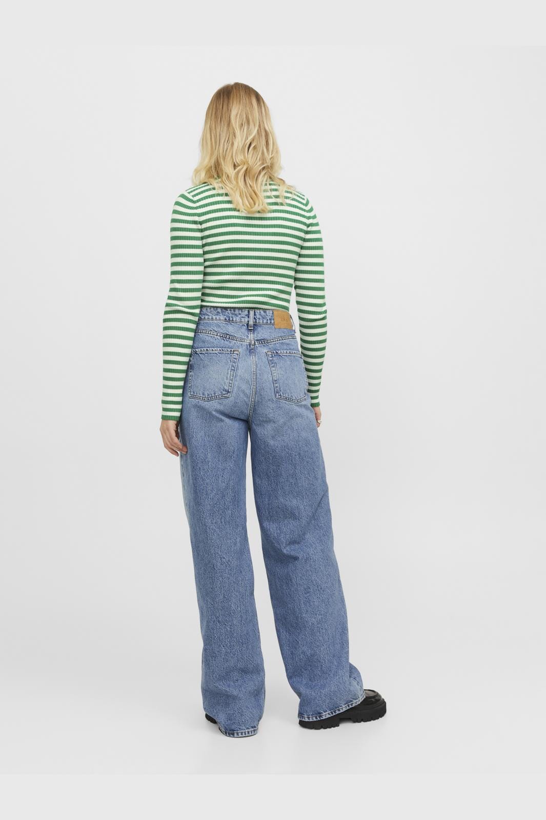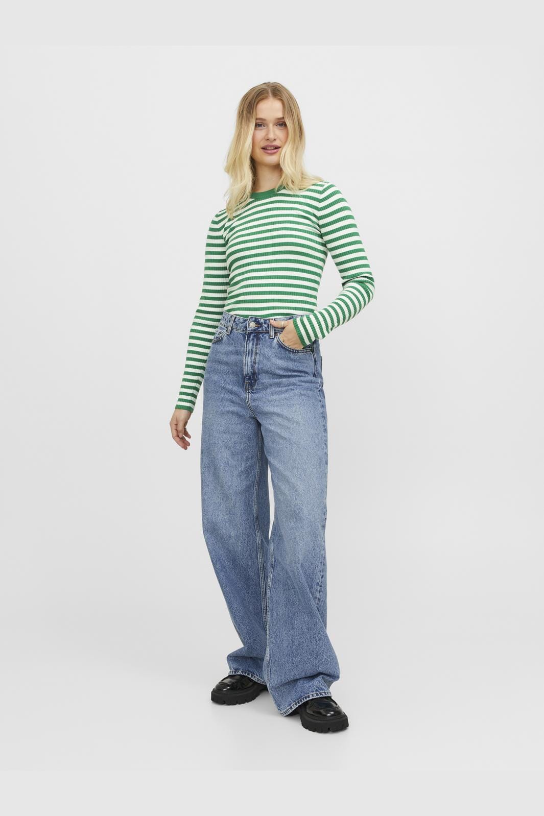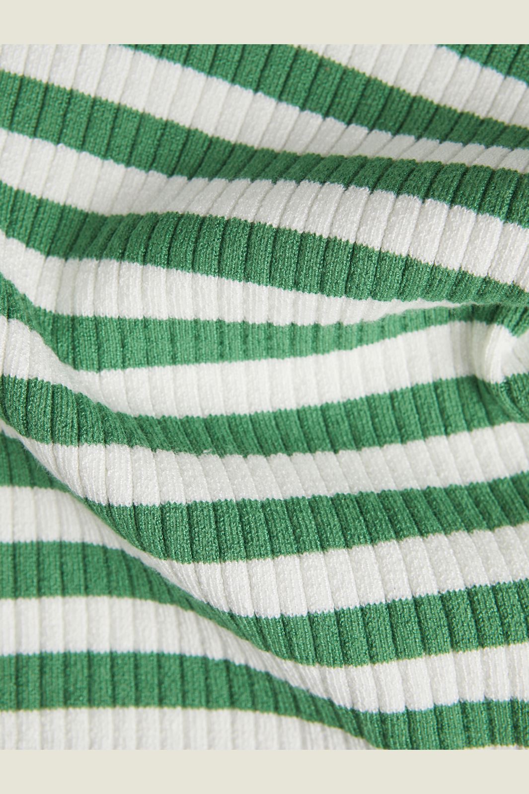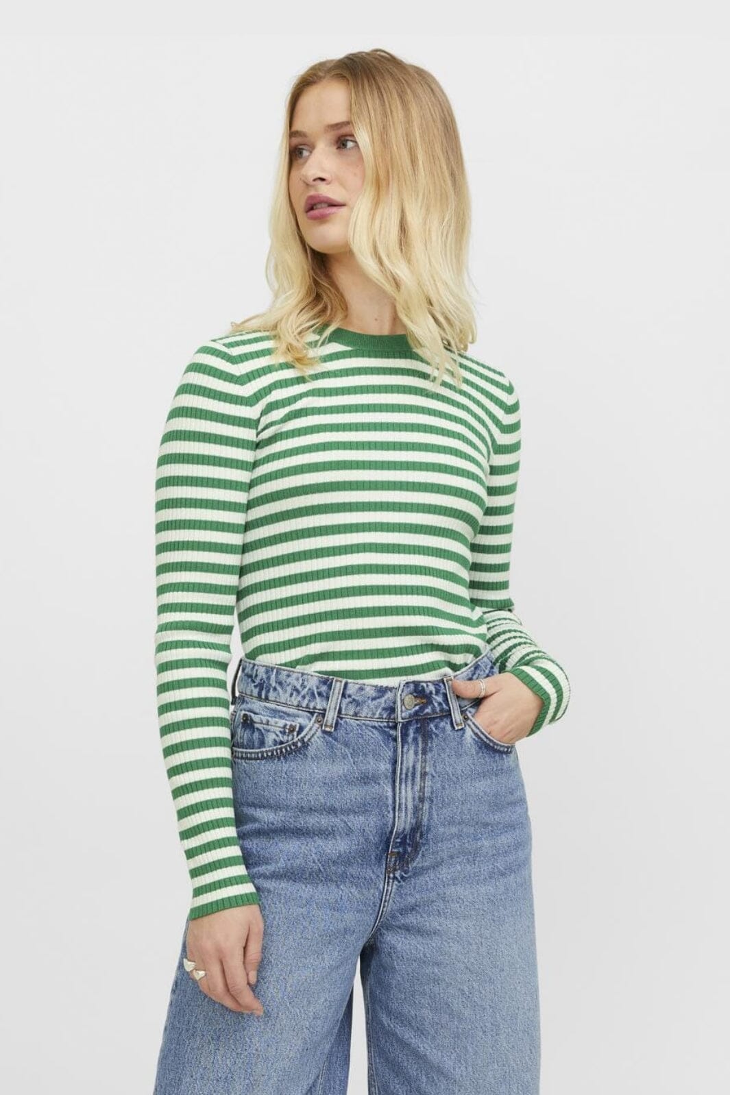 Strikketopp fra Jjxx i ribbestrikk med grønne og hvite horisontale striper. Den har en rund halsutskjæring og lange ermer med en tettsittende passform.