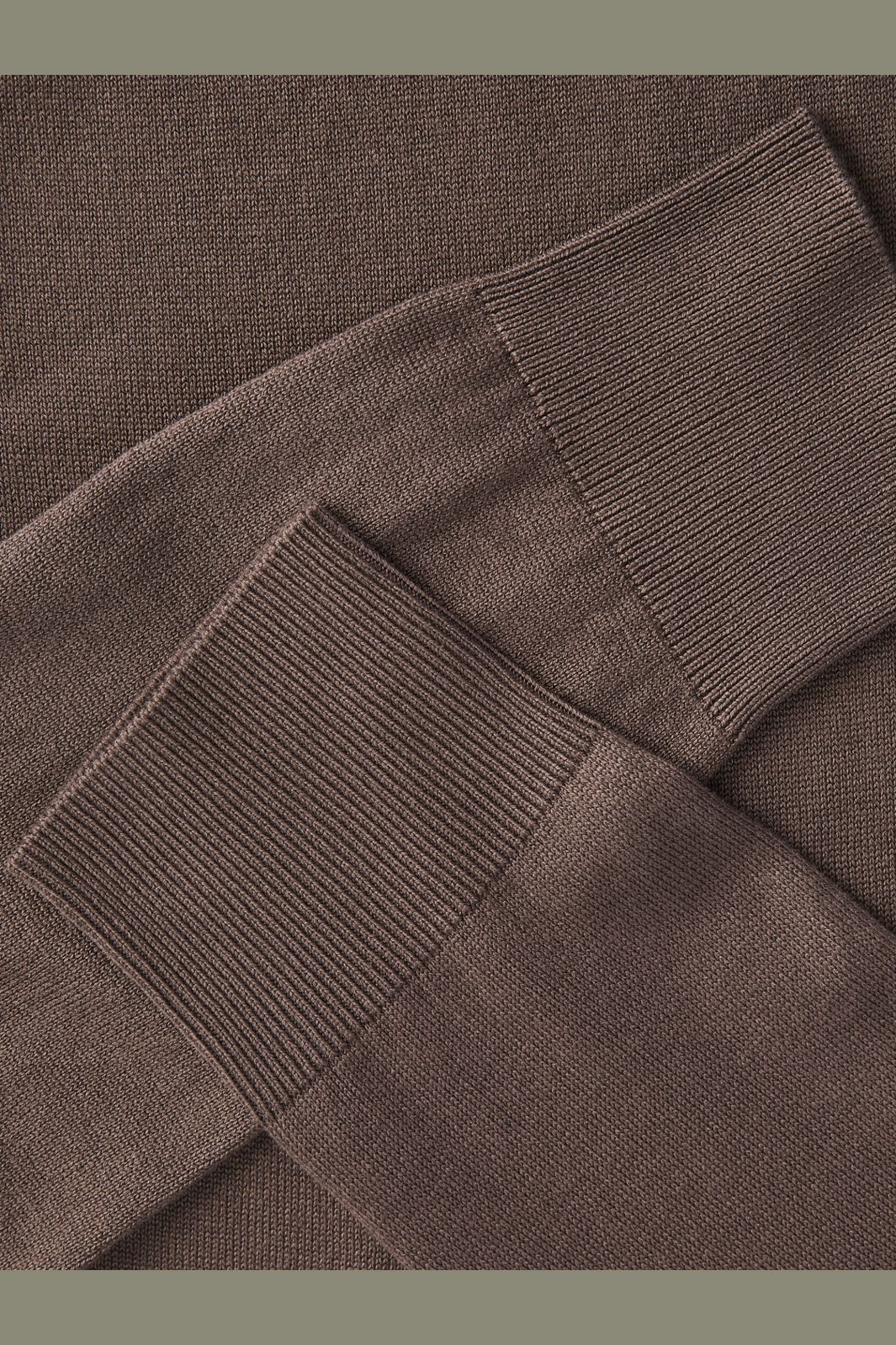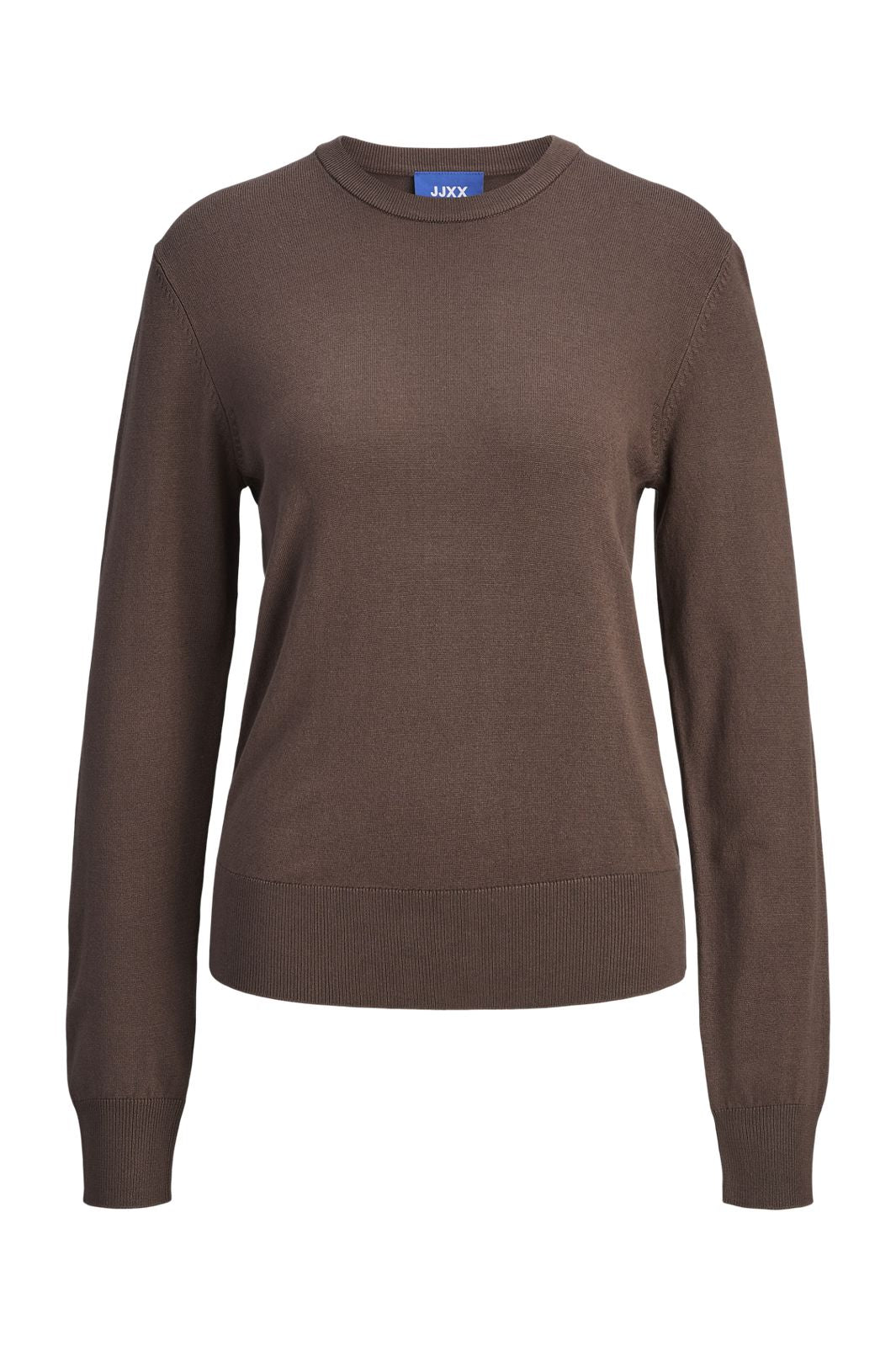 Brun strikkegenser fra Jjxx i flatstrikk. Genseren har en rund halsutskjæring og lange ermer med ribbekant ved håndleddene og nederste kant.