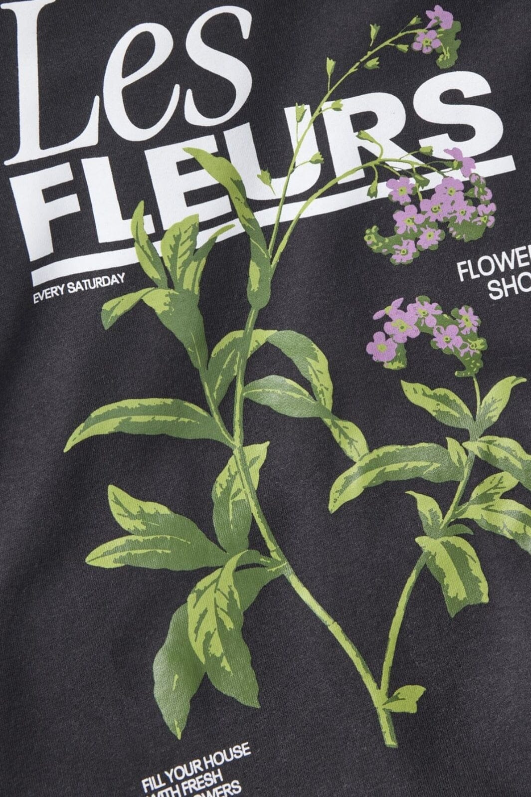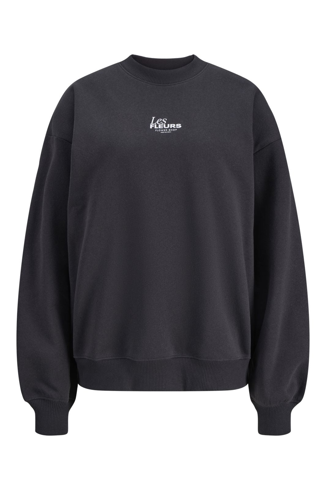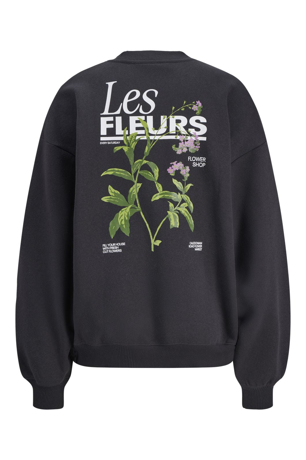 Svart sweatshirt fra Jjxx med loose fit-passform. Forsiden har et blomstermotiv med teksten Les Fleurs og grønne blader med lilla blomster på baksiden.