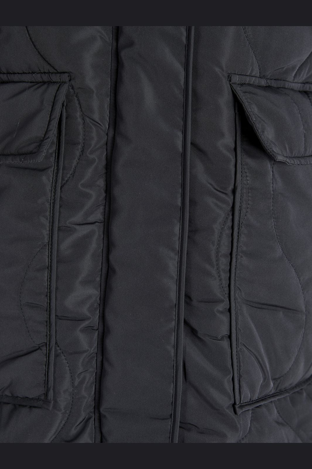 Svart quiltet frakk fra Jjxx med lang passform og synlige sømmer. Frakken har en krage, to forlommer og en skjult glidelås i siden.