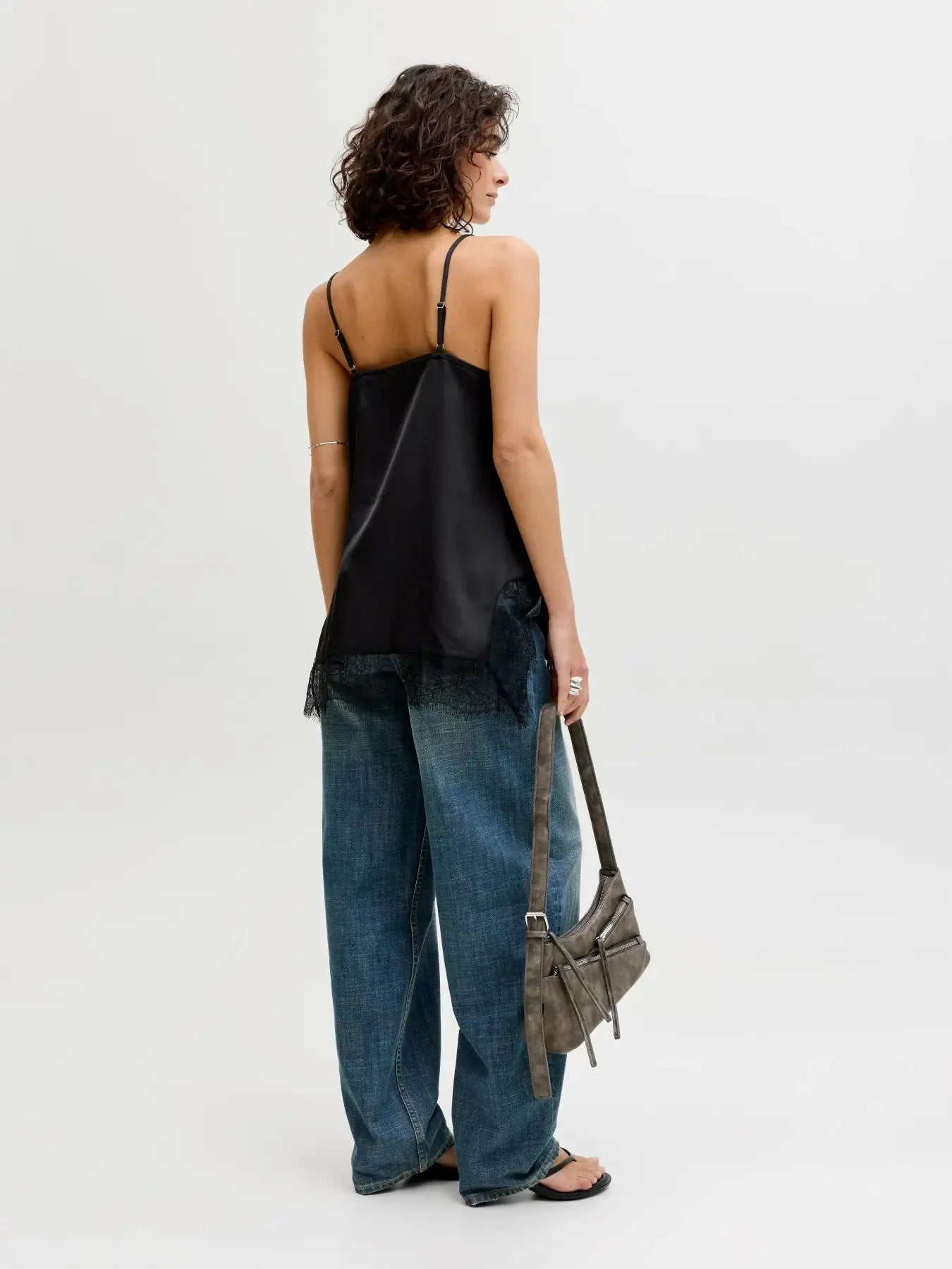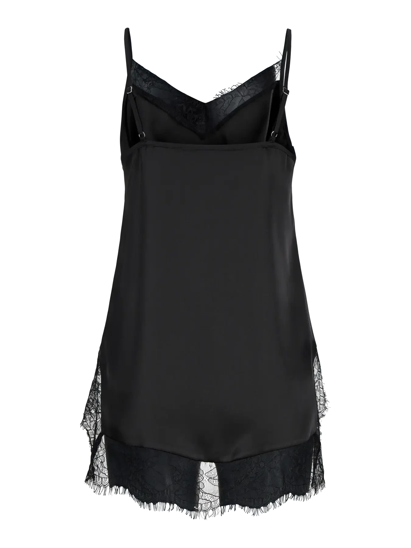 Sort satintopp fra Jjxx med V-hals og blondekant. Toppen har tynne spaghetti-stropper og en løs passform.