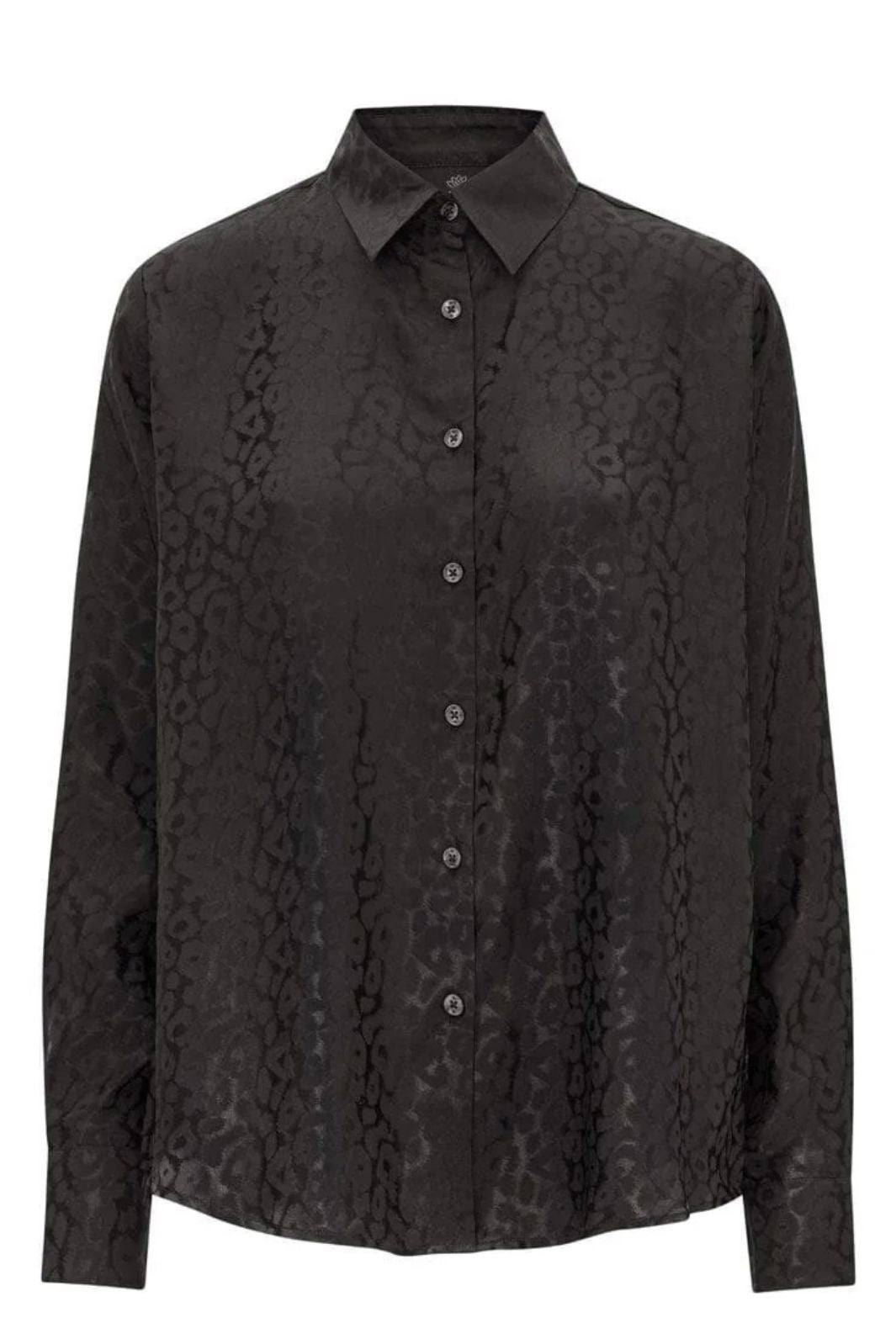 Svart skjorte med et diskret leopardmønster. Den er laget av en blanding av silke og viskose, som gir et mykt og glatt stoff med et subtilt print.
