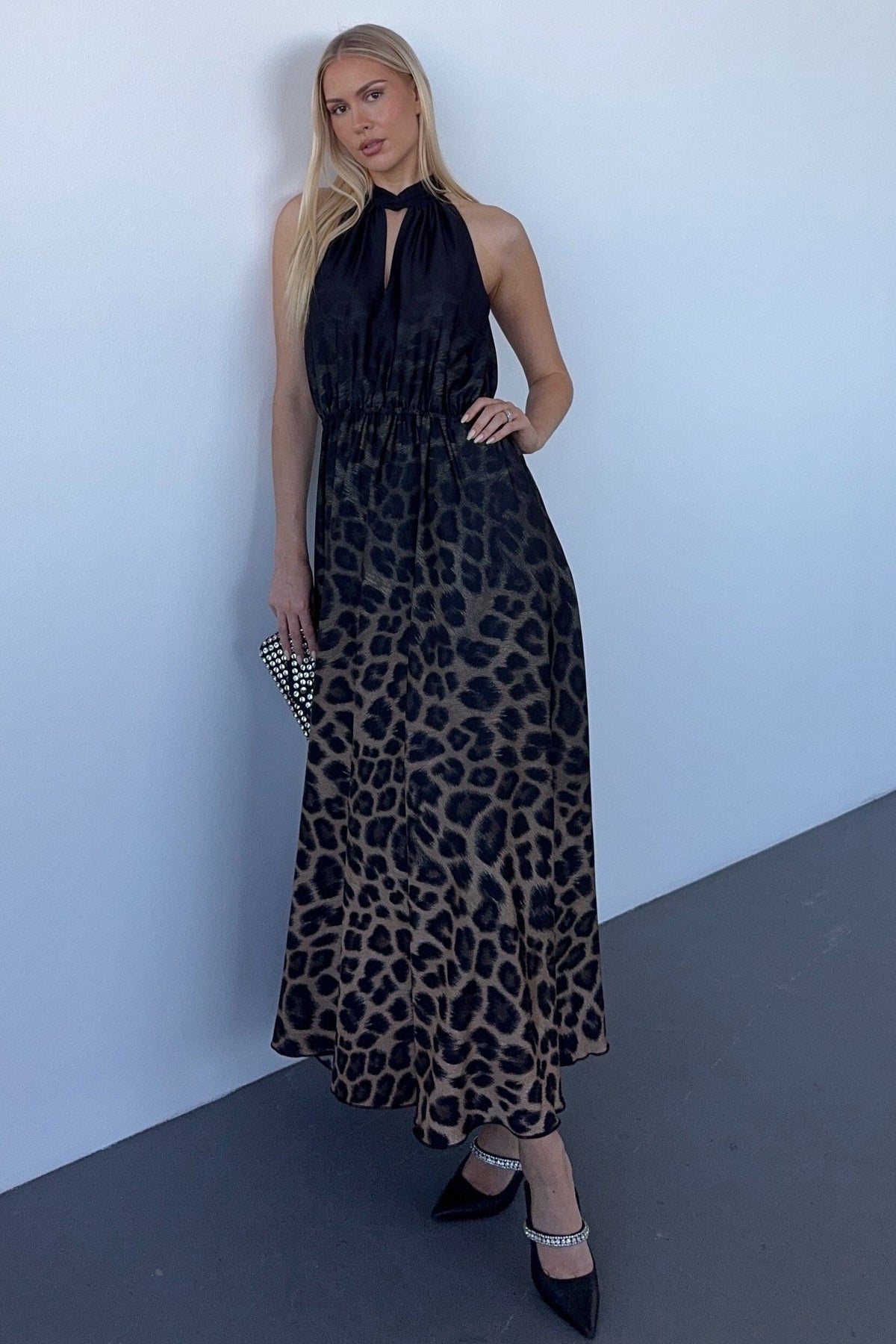 Gulvlang kjole fra Karmamia i svart og beige gradient leopardmønster. Kjolen har en V-utringning kombinert med halterneck og en elastisk midje, som gir god bevegelighet.