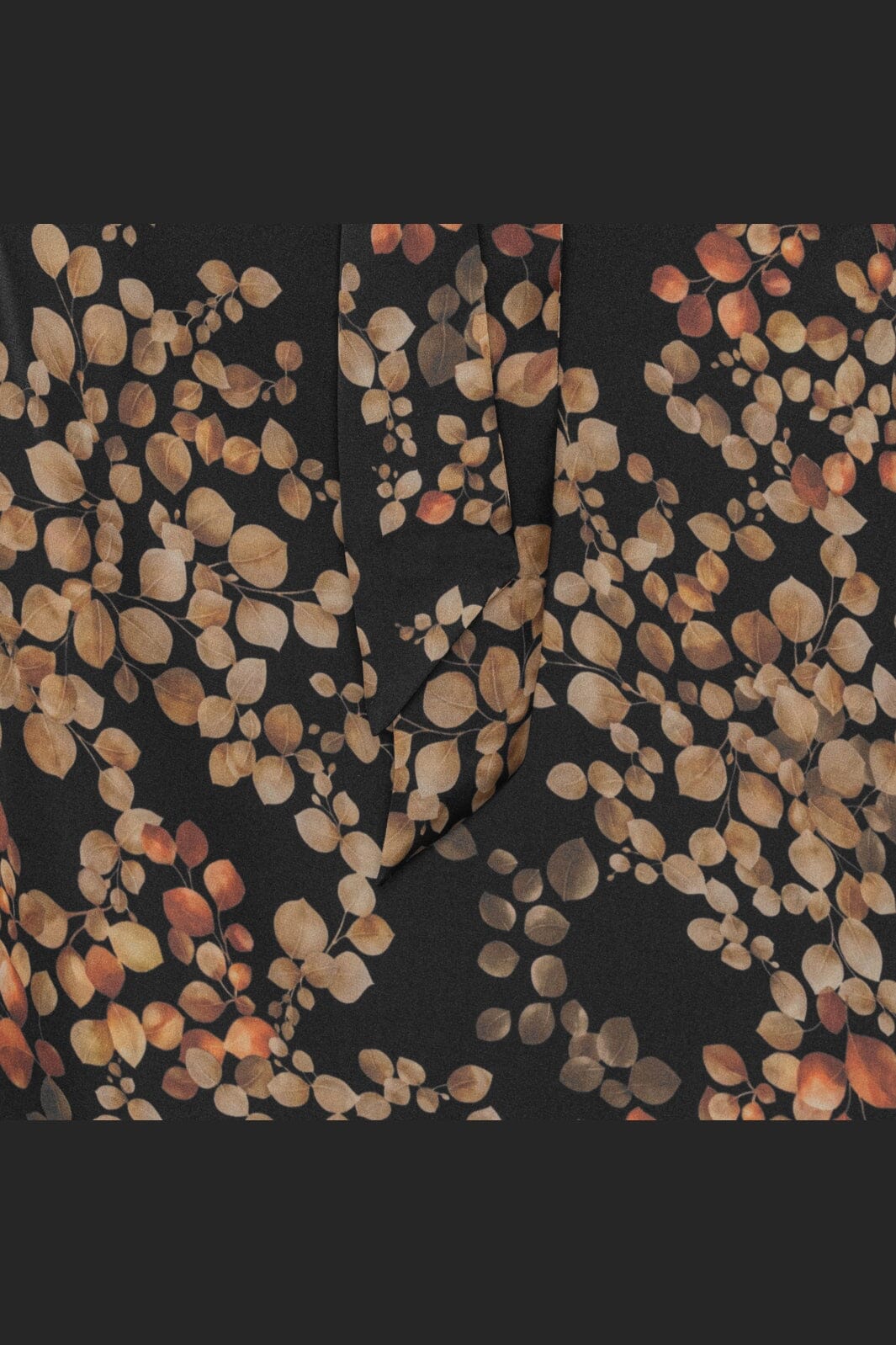Langt skjørt fra Karmamia med blomsterprint i brune og oransje nyanser på svart bakgrunn. Det har volangkant nederst og knytebånd i midjen.
