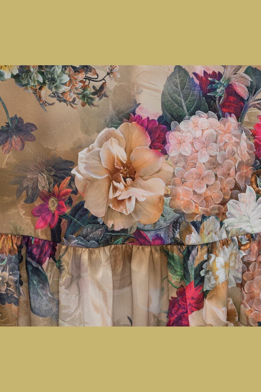 Langt skjørt fra Karmamia med blomstertrykk på gyllen bakgrunn. Skjørtet har volangdetaljer ved kanten og et lagdelt design.