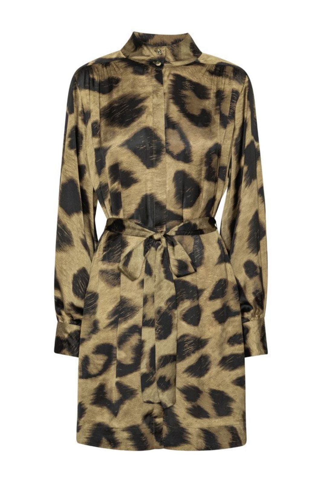 Kjole fra Karmamia med leopardmønster i khaki og svart. Den har skjortekrage, lange ermer og et belte i midjen.