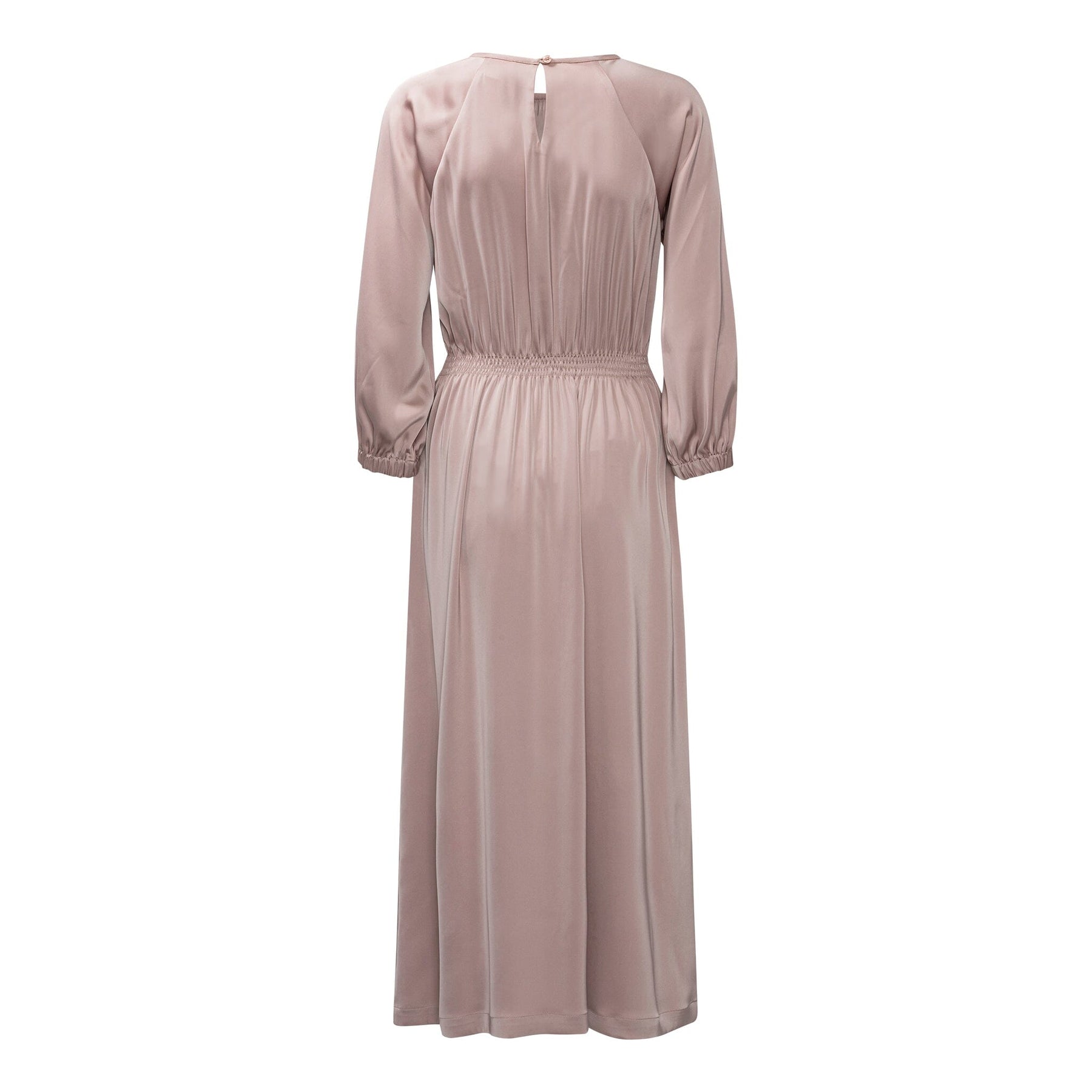 Rosa kjole fra Karmamia, laget av sateng i en myk rosanyanse. Kjolen har legg-lengde og 3/4-ermer.