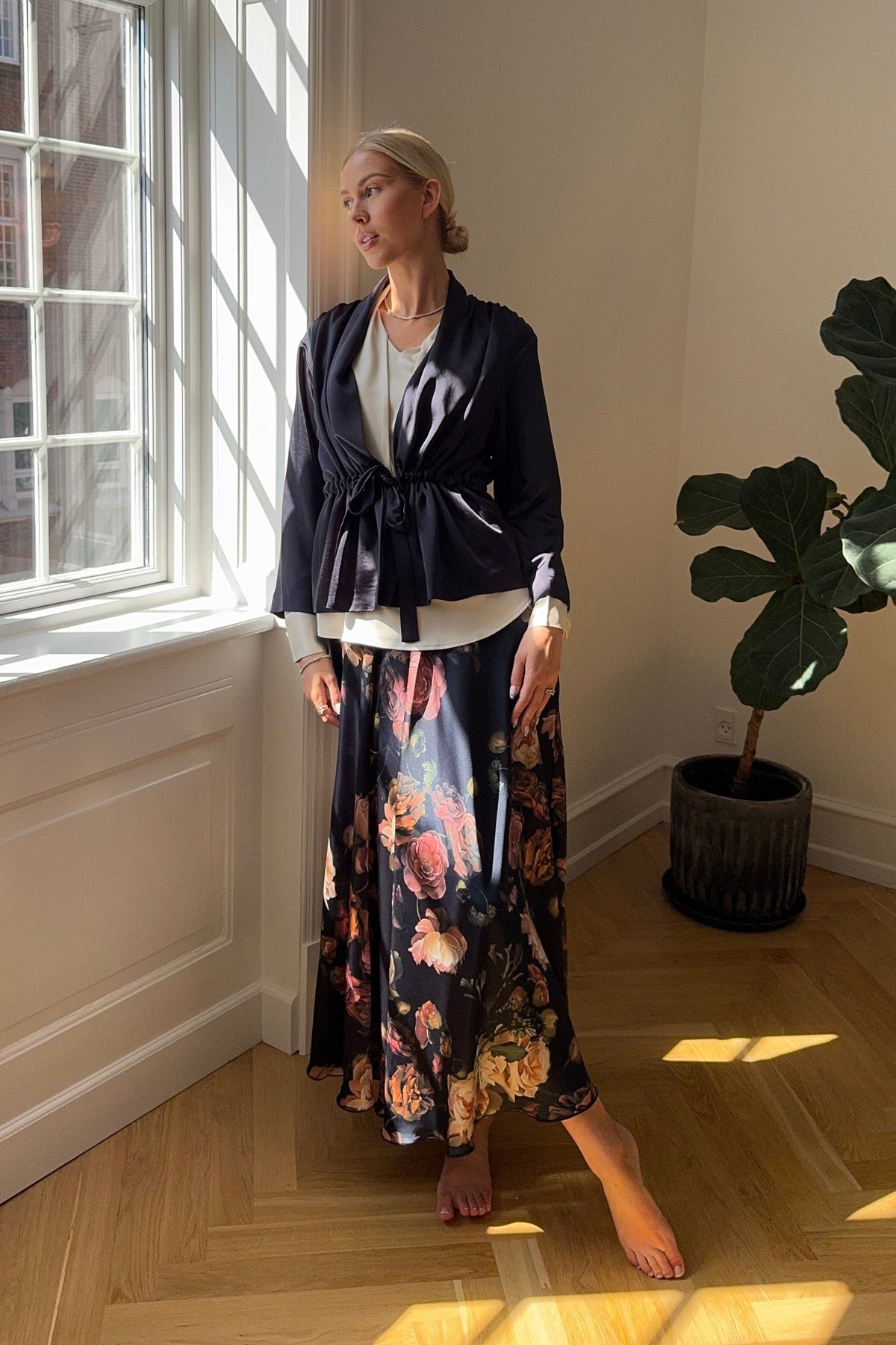 Svart skjørt fra Karmamia med blomstermønster i rosa, fersken og kremnyanser. Det har en høy midje og rekker til midt på leggen. Stoffet faller mykt og har en glatt overflate.