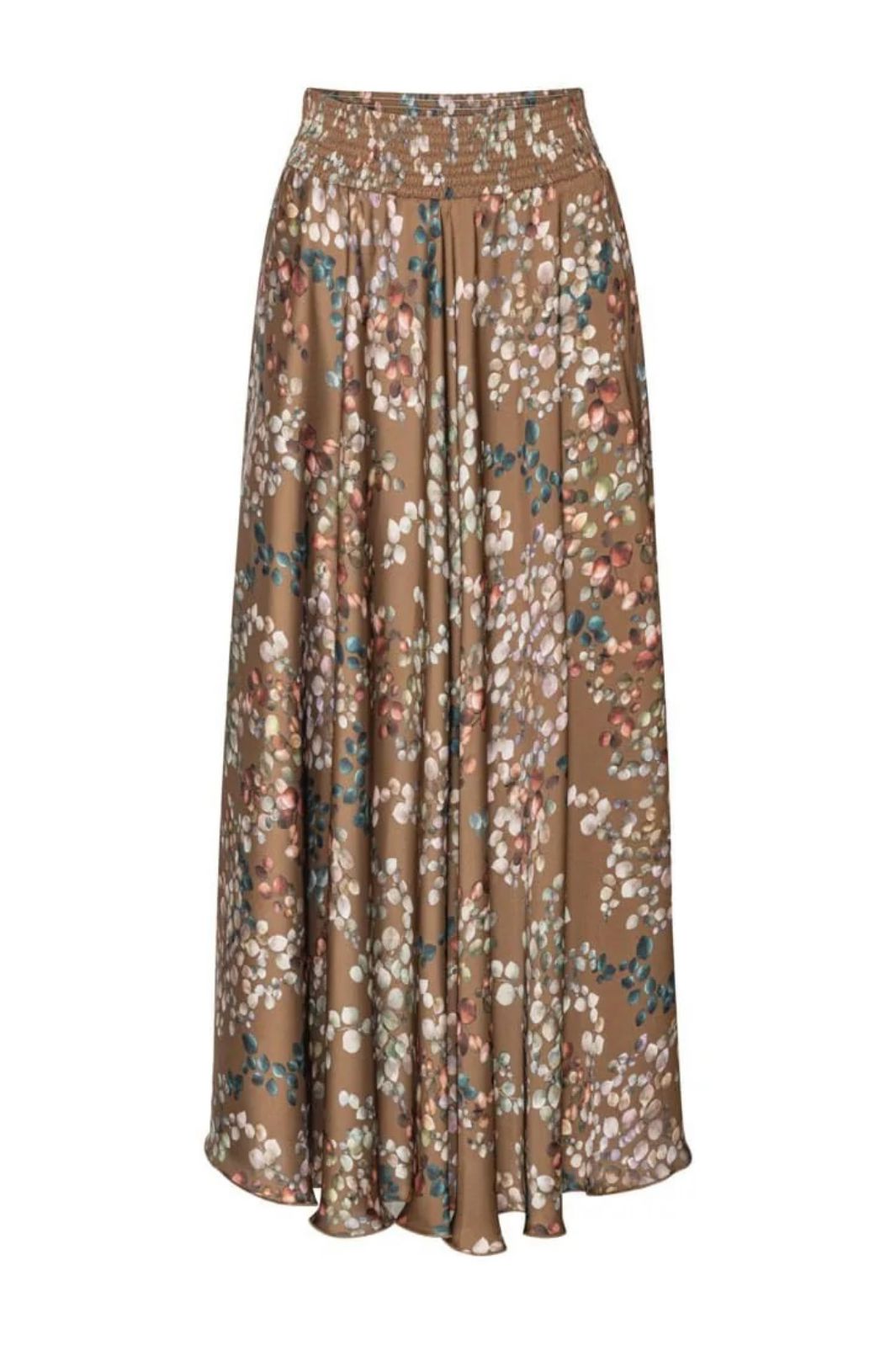 Brun skjørt fra Karmamia med blomstermønster i varme nyanser. Stoffet har et mykt fall med detaljer i rosa, grønn og blå på den brune bakgrunnen.