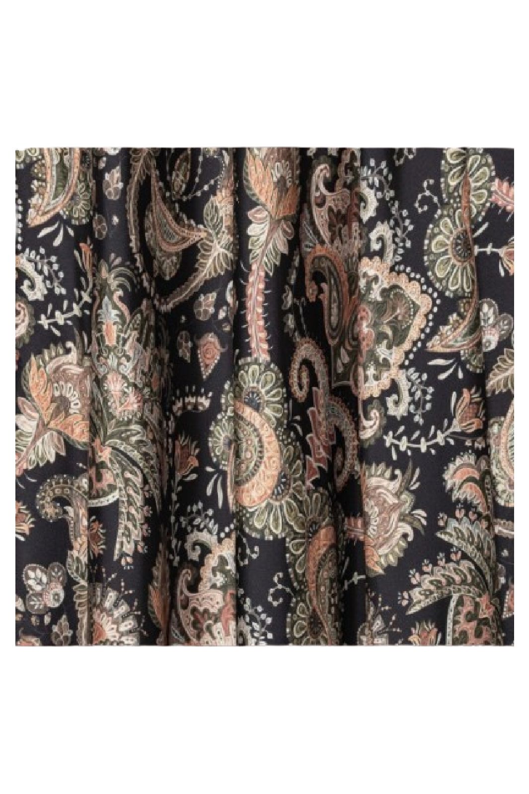 Langt skjørt fra Karmamia med paisleymønster i khaki, grønn og svart. Skjørtet har høy midje og et flytende snitt med volangdetaljer.