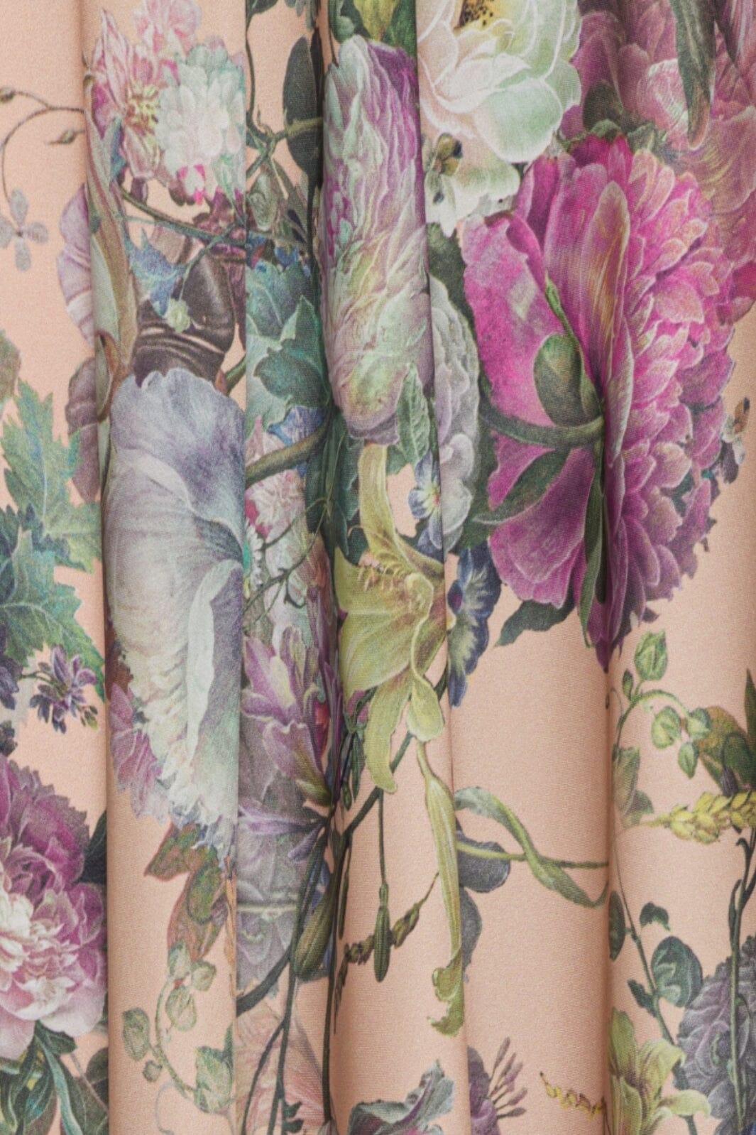 Ferskenfarget skjørt i satin med blomsterdesign i rosa, grønt og lilla. Det har høy midje med elastikk og ankellengde med volanger.
