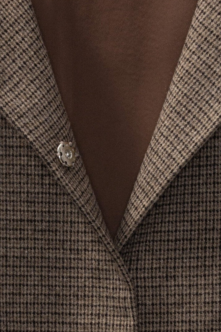 Rutete jakke fra Karmamia i brun nyanse. Jakken har peplumermer med lagdelte volanger og to synlige metallknapper ved halsutskjæringen.
