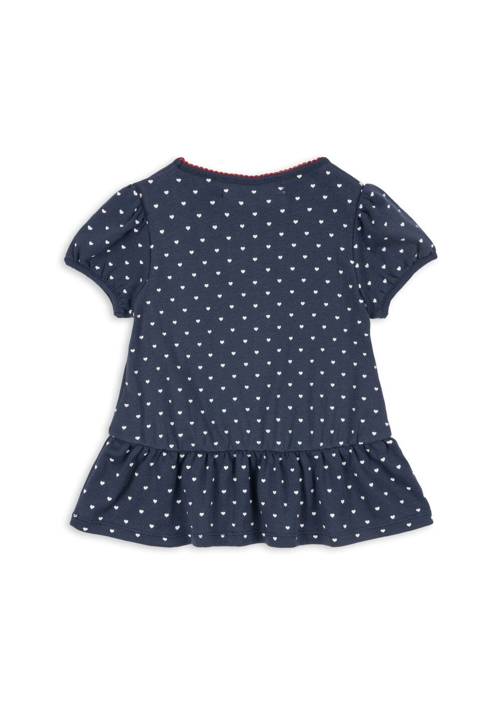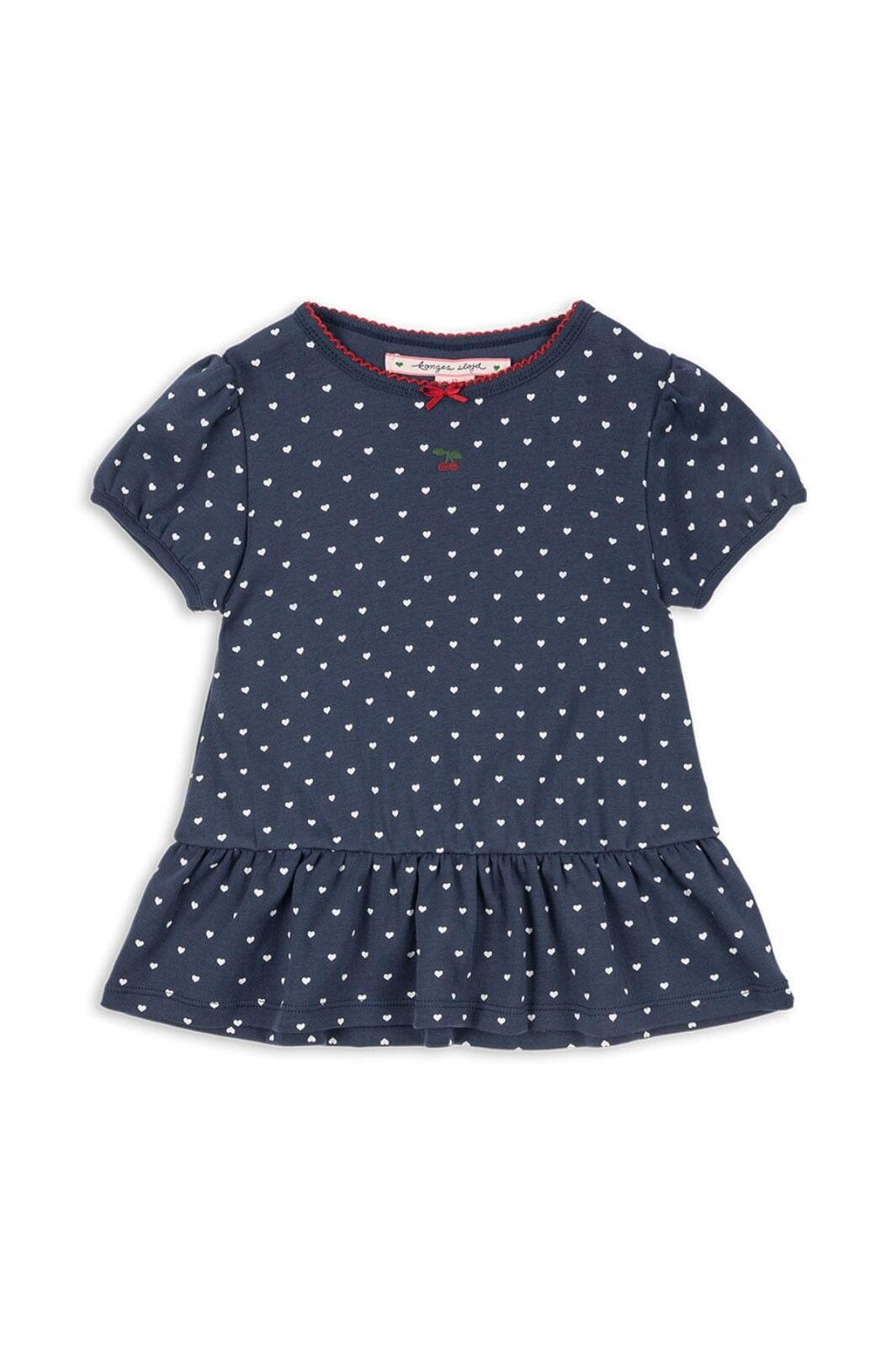 T-skjorte fra Konges Sløjd i mørkeblå med hvitt hjerteprint. Laget av 100 % økologisk bomull med dekorative detaljer.