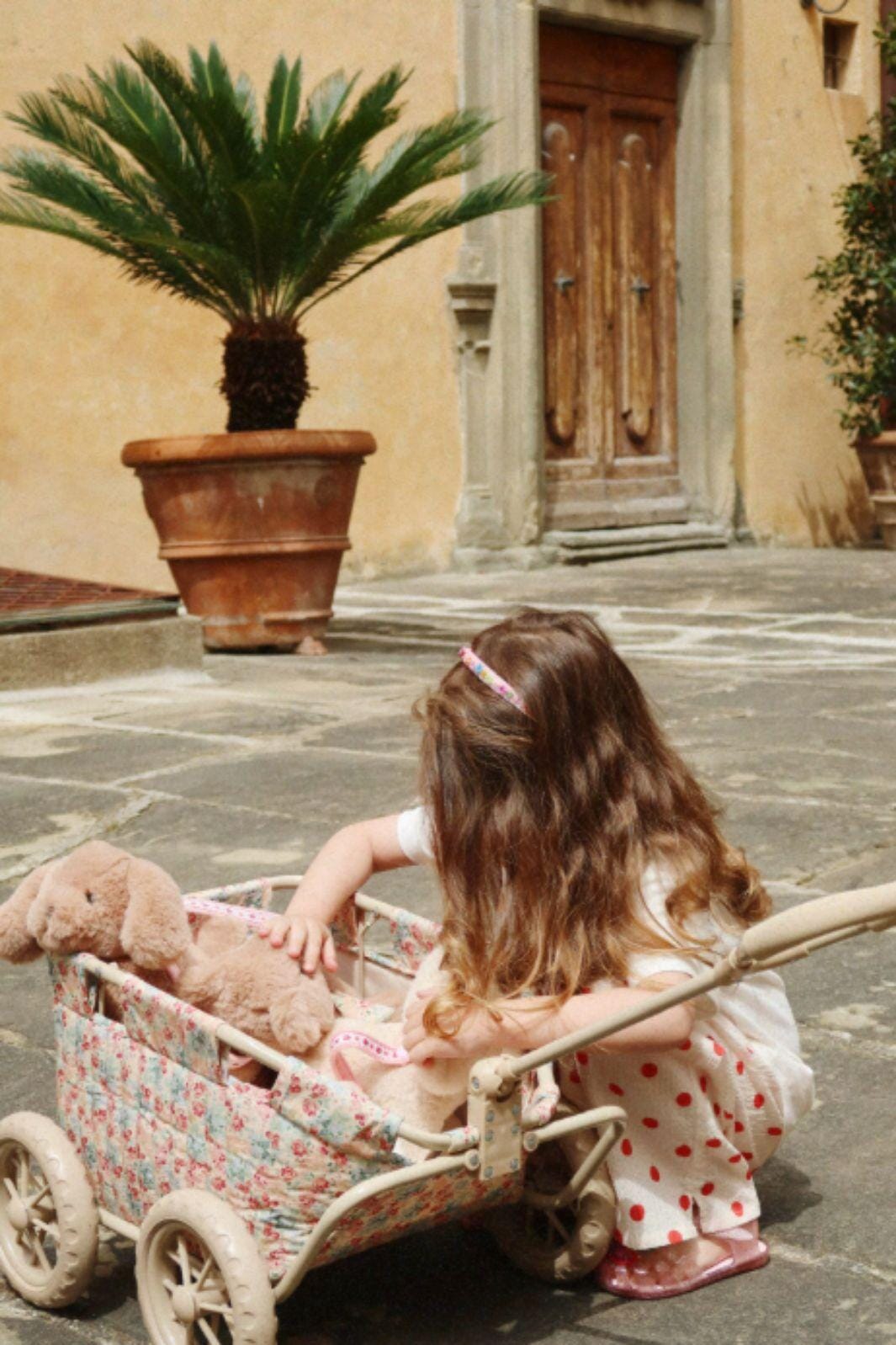 En trekkvogn fra Konges Sløjd med blomstermønster i beige og lyserosa nyanser. Jernrammen gir stabilitet, og de store EVA-hjulene er egnet for utendørs bruk.