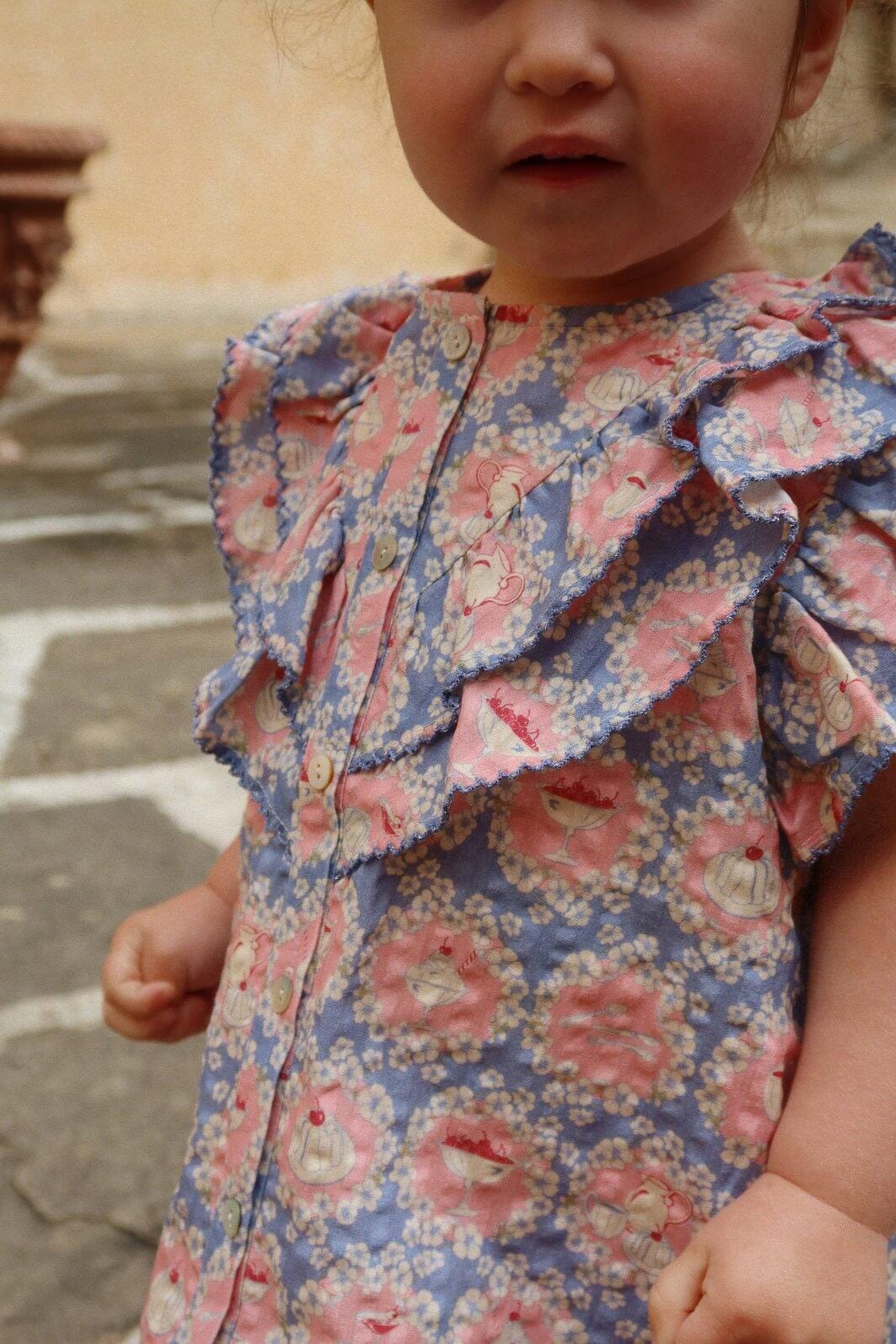 Skjorte fra Konges Sløjd i 100 % økologisk bomull med et rosa og blått mønster av blomster, is og kopper.