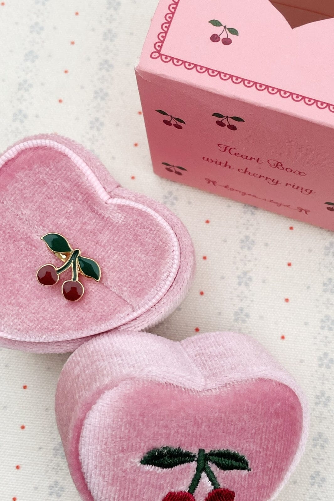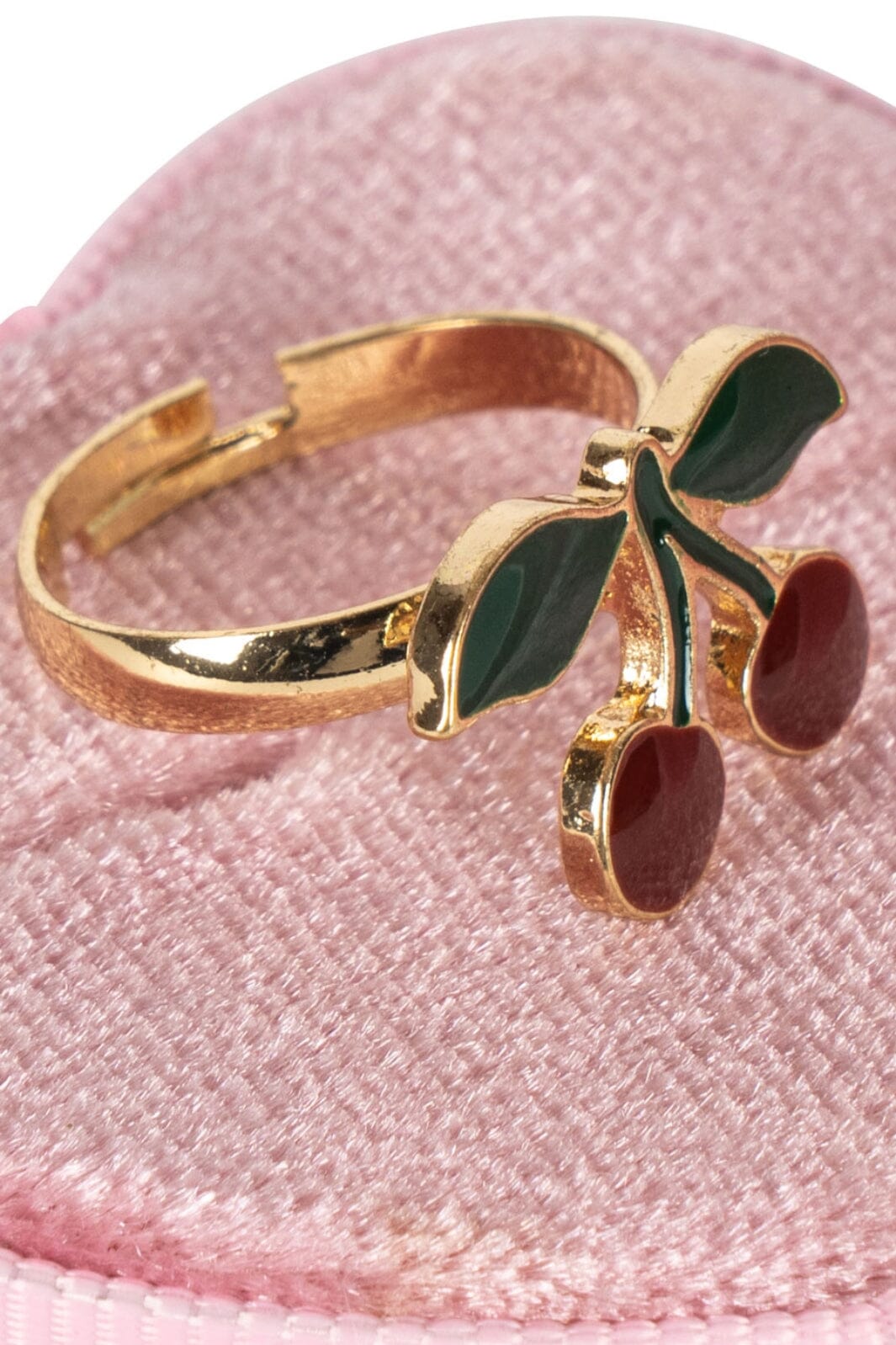 En ring fra Konges Sløjd med kirsebærmotiv og grønne blader. Den rosa ringen kommer i en hjerteformet eske med matchende design.